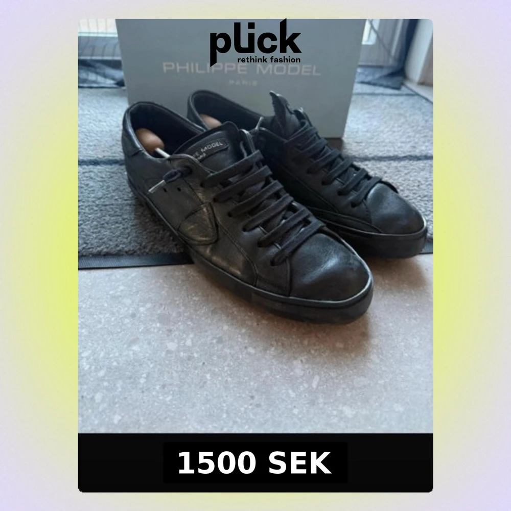 Säljer ett par svarta Philippe Model sneakers i skinn med klassisk låg profil och rund tå. Skorna har svarta snören, diskret logga på plösen och sidorna samt en platt sula med fiskbensmönster undertill. Perfekta för dig som gillar stilrena och tidlösa sneakers.