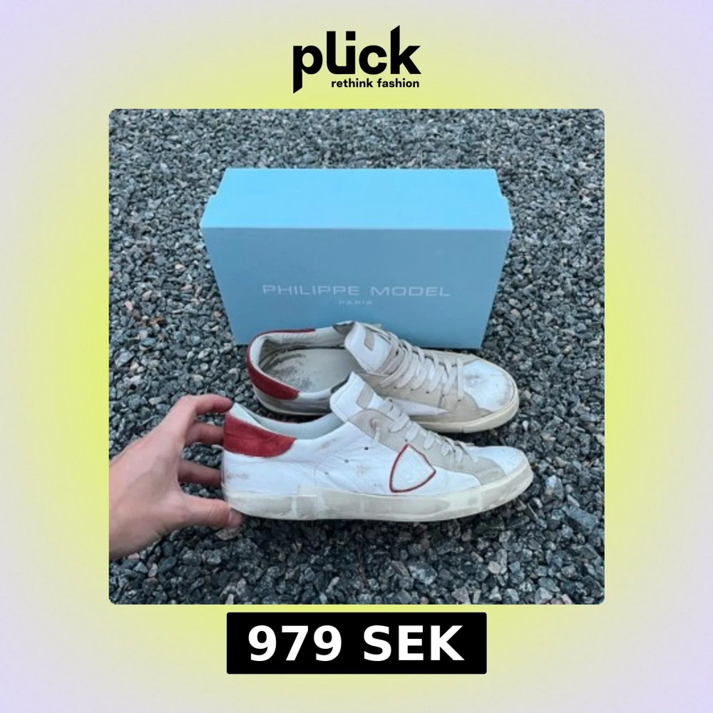 Snygga vita Philippe Model sneakers med röd mockadetalj på hälen och beige partier i skinn och mocka. Lite slitna som ni kan se på bilderna men fortfarande mycket kvar att ge skorna och boxen följs med vid köp. 47.