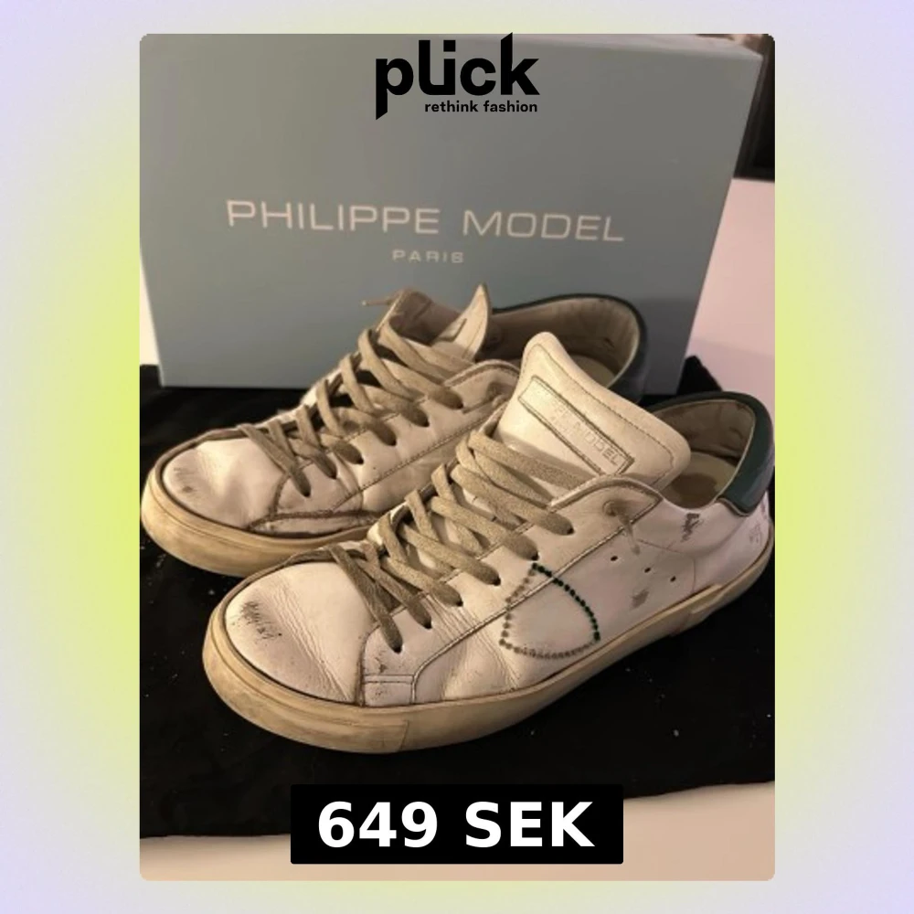 Säljer ett par vita Philippe Model prsx med gröna detaljer. 🙌nypris 320€🙌 Skorna har används flitigt men har blivit väl omhändertagna. Innersulan är lite sönder och längst bak på sulan har det slitigts igenom på båda skorna. Men annars är dem i relativt bra skick