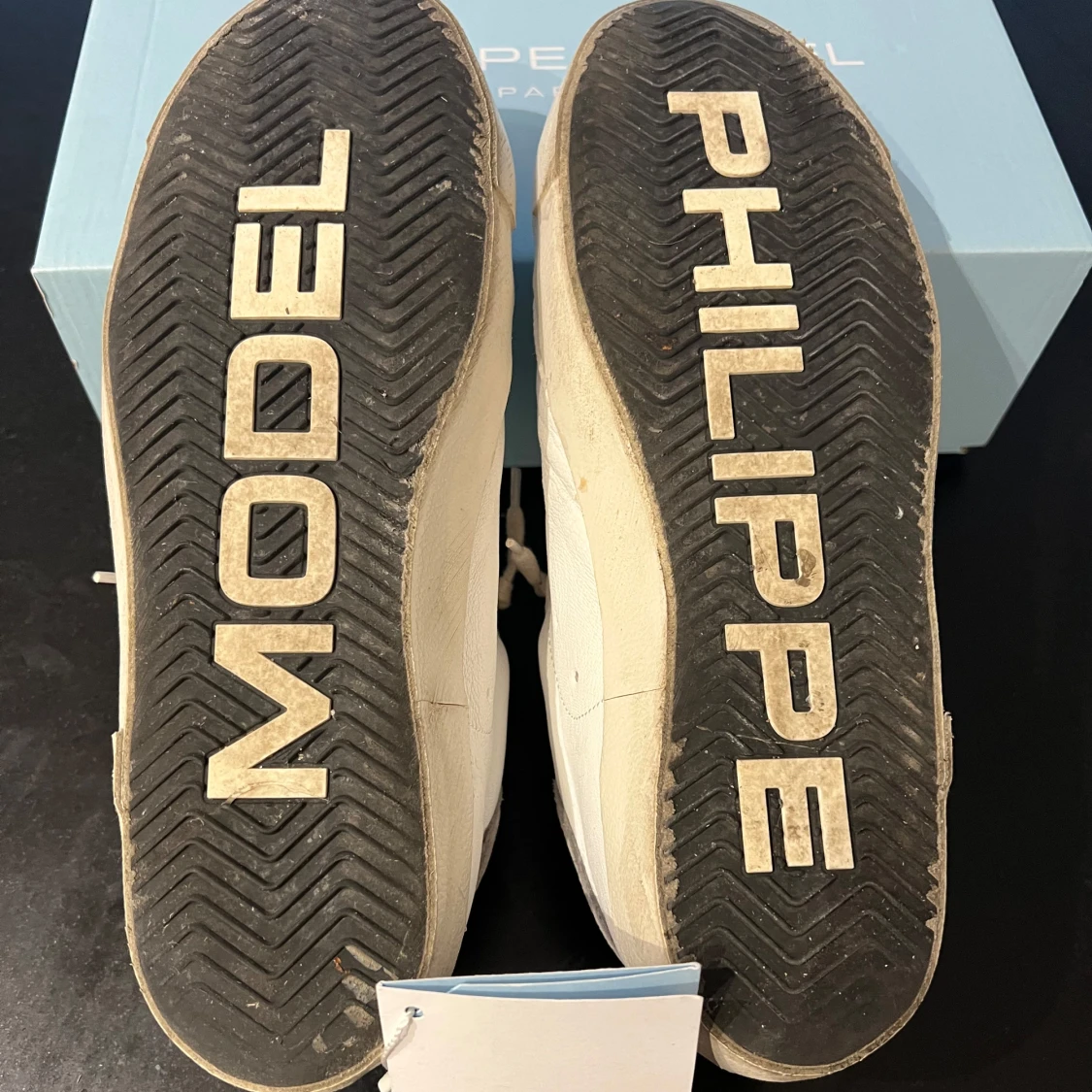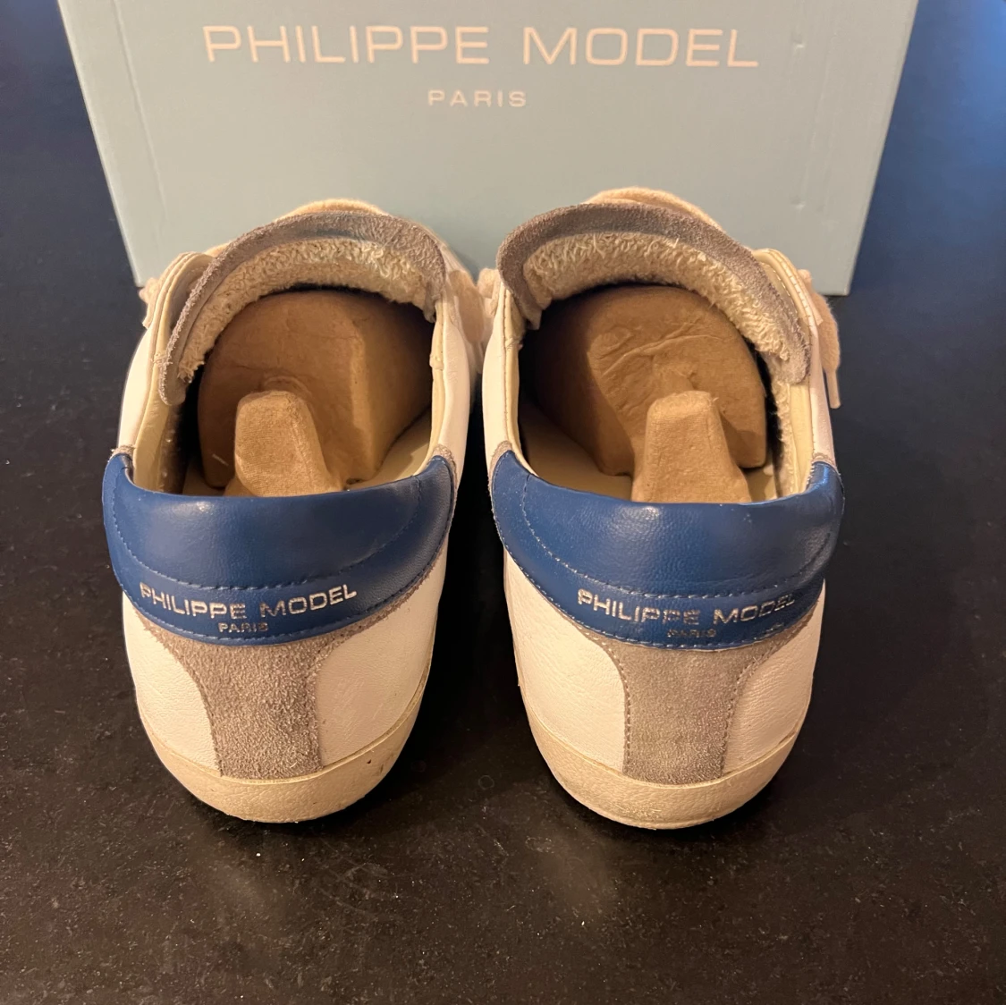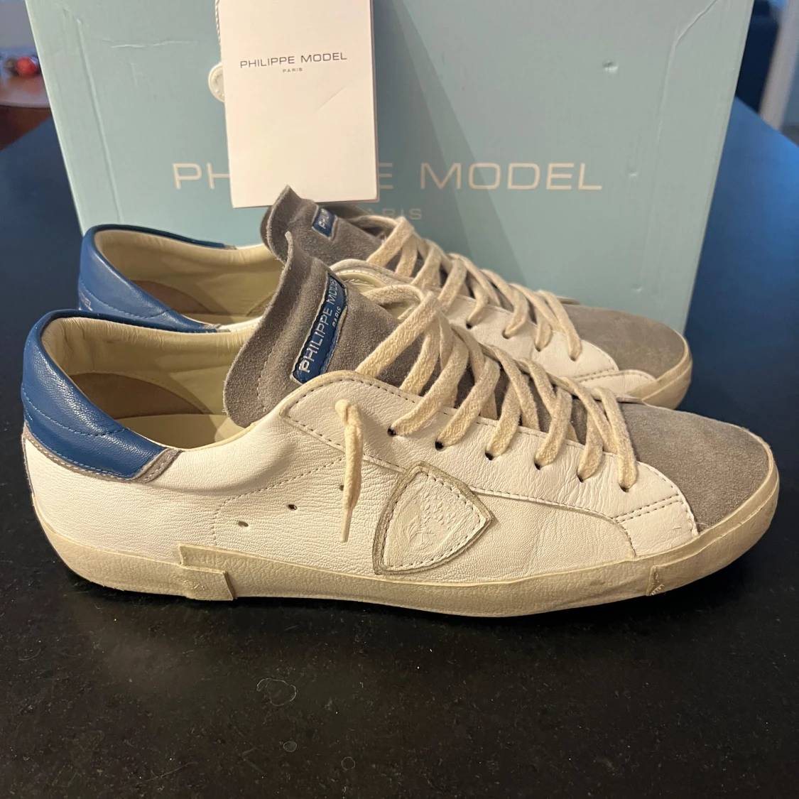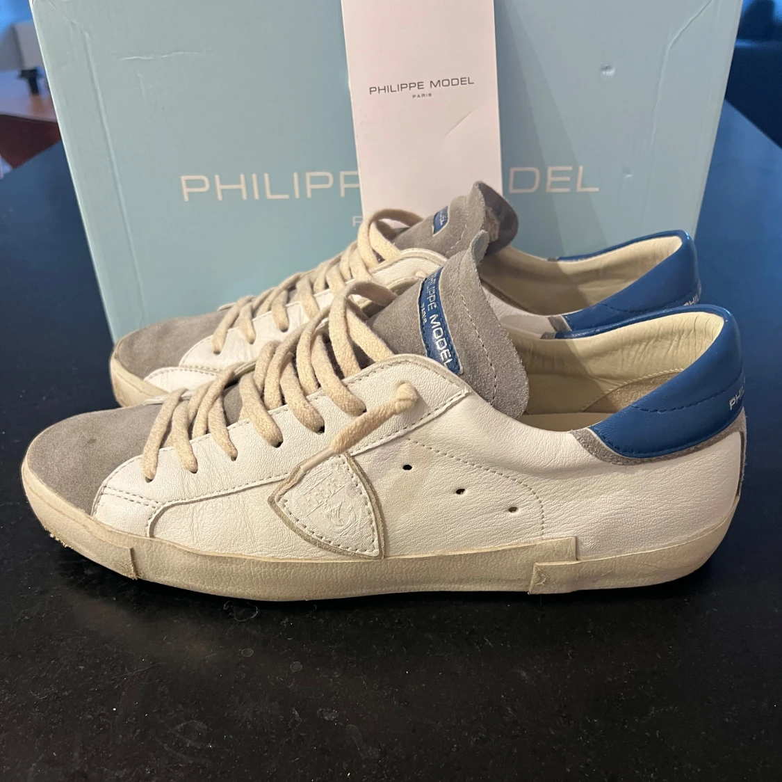 Snygga Philippe Model sneakers i vitt och grått med blå detaljer. Skorna är i storlek 44 och är i mycket bra skick! 😀