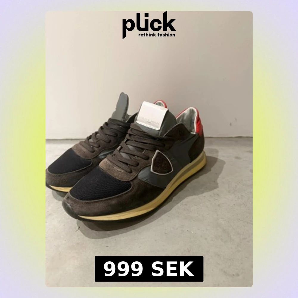Snygga sneakers från Philippe Model i brunt mocka och textil med grå detaljer och röd häl. Skorna har snörning, svart mesh framtill och gul/beige sula. Perfekta för dig som vill ha en unik och sportig look.