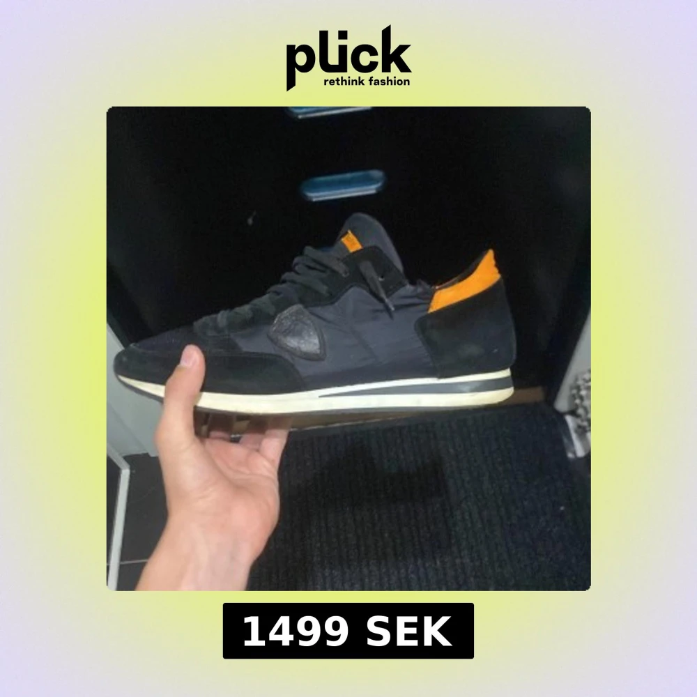 Svarta sneakers från Philippe Model med snygga orange detaljer, skorna vad köpta nya fast boxen finns inte kvar. Inte några farliga defekter och är fortfarande användbara. Pris kan diskuteras