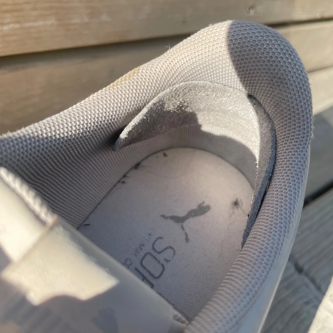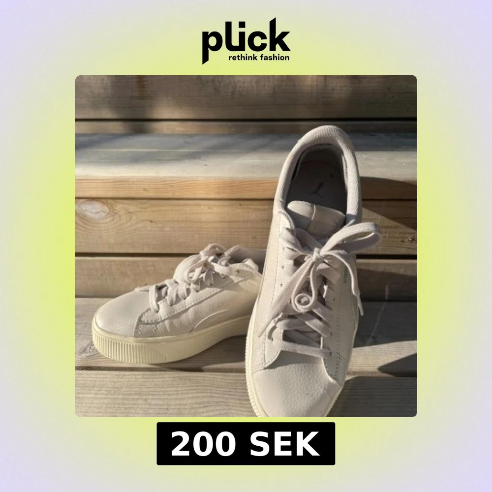 Snygga vita sneakers från Puma med klassisk design och diskret logga på plösen. Skorna har snörning, platt sula och är gjorda i skinn med textildetaljer runt öppningen. Perfekta för en clean och stilren look. Defekterna syns på de tre sista bilderna, revor på framsidan och hål i hältyget varav en har reparerats.