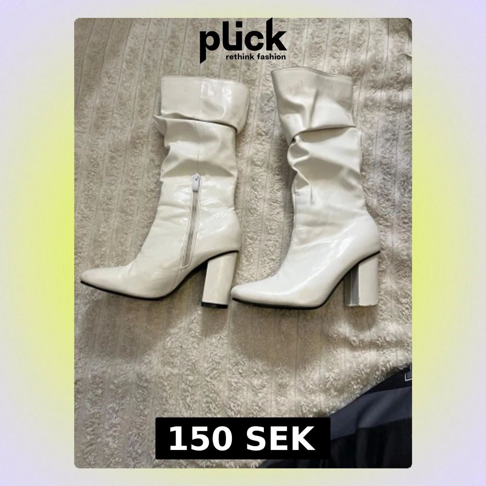 Säljer ett par vita stövletter med hög klack och spetsig tå. Skorna har dragkedja på sidan och är gjorda i glansigt syntetmaterial. De har en slouchy passform upptill och en chunky klack som ger extra attityd.