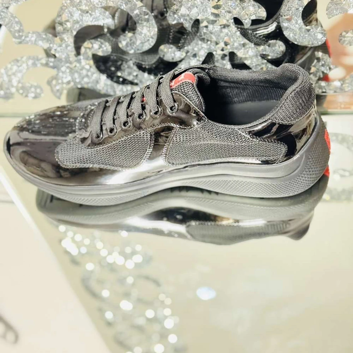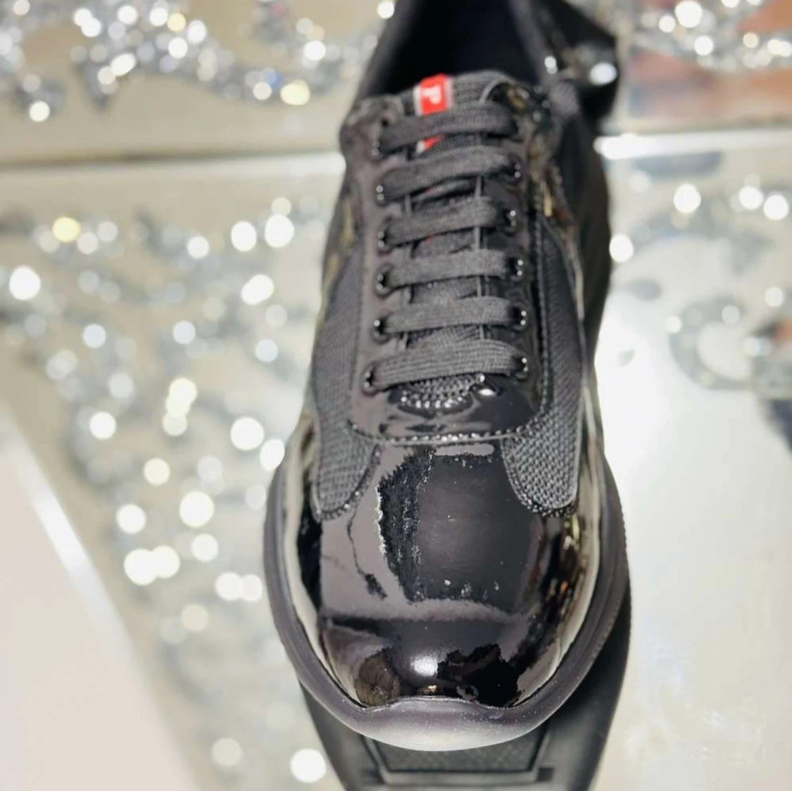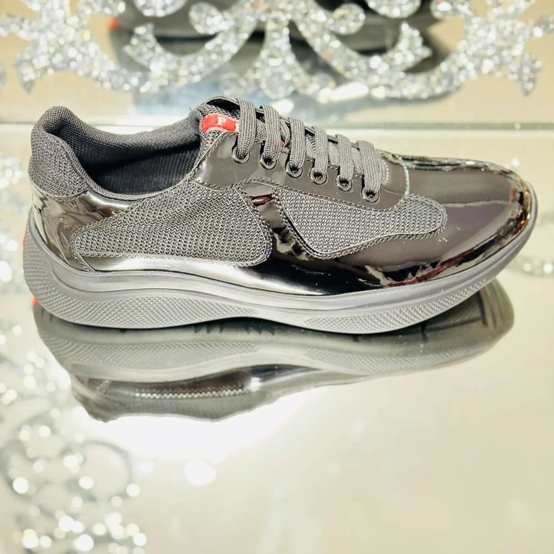 Snygga svarta Prada cups meshpaneler på sidorna. Skorna har rund tå, platt sula och snörning framtill. Perfekta för dig som gillar en modern och sportig look med lite extra edge.