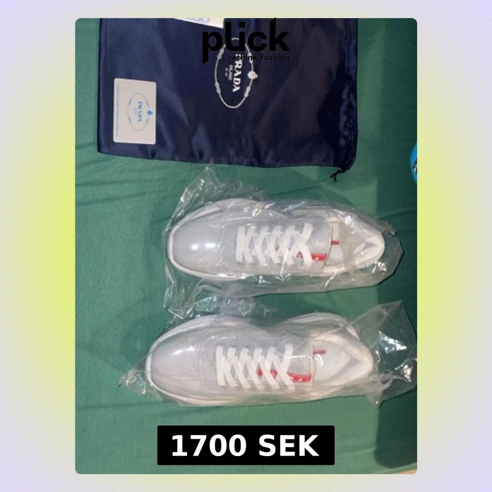 Säljer ett par fräscha vita sneakers från Prada med klassisk röd logga på plösen. Skorna har snörning och är tillverkade i en kombination av syntet och skinn, vilket ger en clean och modern look. Perfekta för dig som gillar exklusiva märken och stilren design.