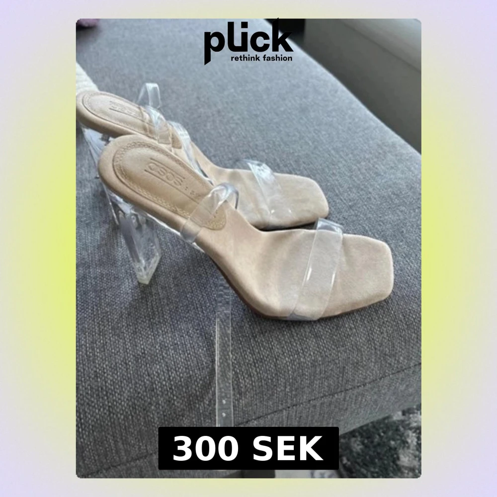 Säljer ett par trendiga sandaler från ASOS i beige med transparenta remmar och klack. Skorna har fyrkantig tå och en cool, genomskinlig plattformklack som ger en modern vibe. Perfekt för dig som gillar stilrena detaljer och vill sticka ut.