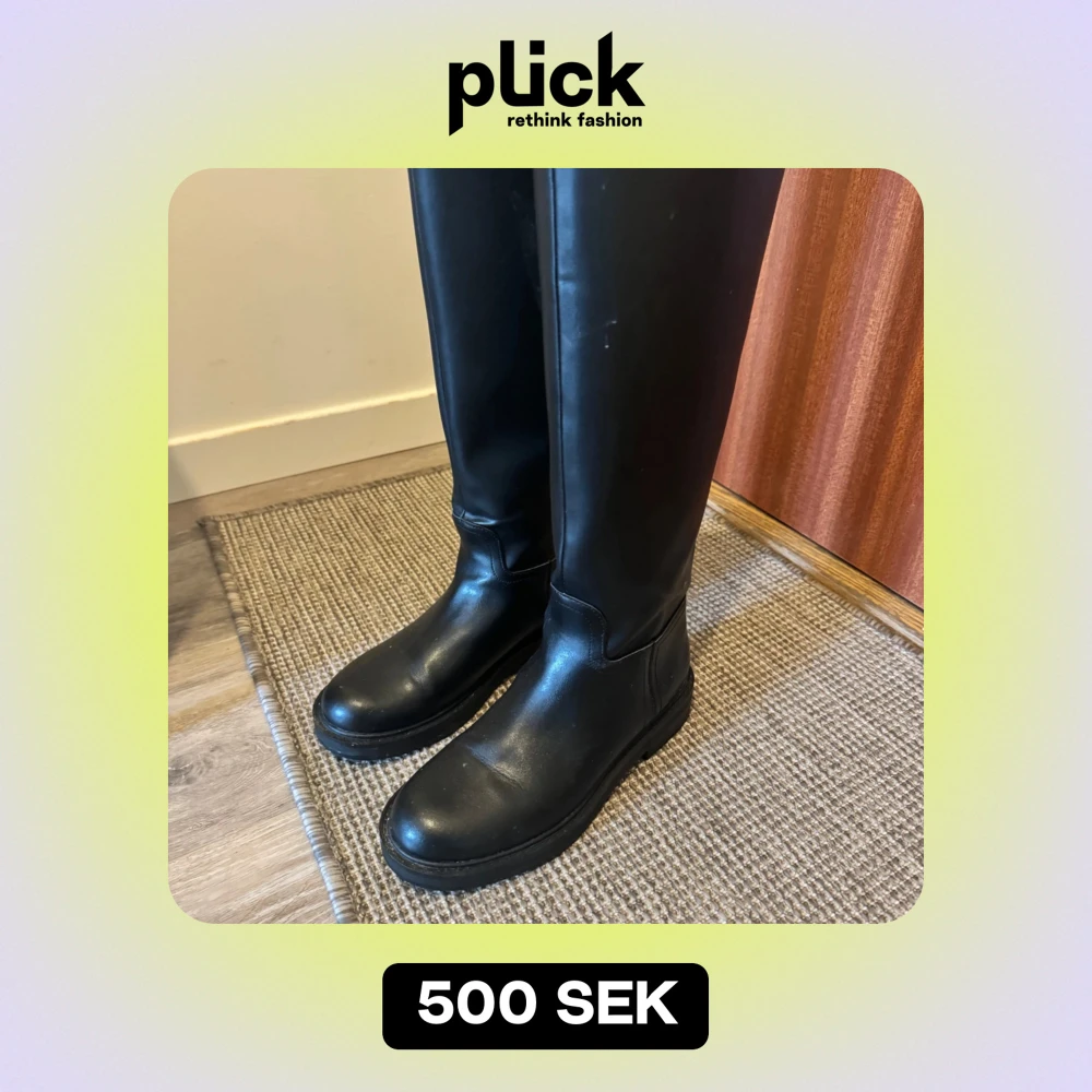 Snygga svarta höga stövlar i skinn. Endast använd under ett tillfälle, köpt för en vecka sedan! Väldigt stor i storleken, passar mig som har 37.5 i vanliga fall