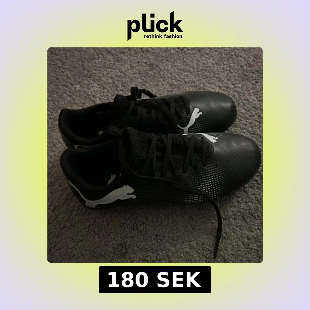Säljer ett par svarta fotbollsskor från Puma med vit logga på sidan. Skorna har snörning och mönstrad sula med dobbar för bra grepp på planen. Använda 2 ggr