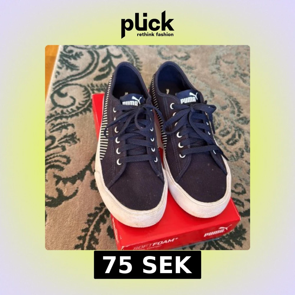 Snygga mörkblå sneakers från Puma med vit randig detalj på sidan och klassisk logga på hälen. Skorna har snörning och platt vit sula. Ovandelen är i textil och insidan har SoftFoam+ för extra komfort. Perfekt för dig som gillar stilrena och sportiga skor.Säljer pga storleken passar inte därav priset.Först till kvarn!