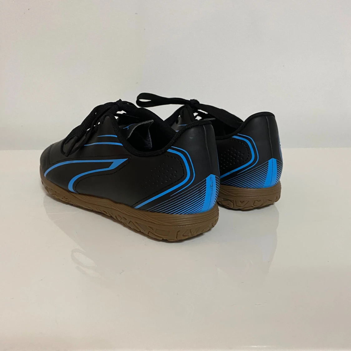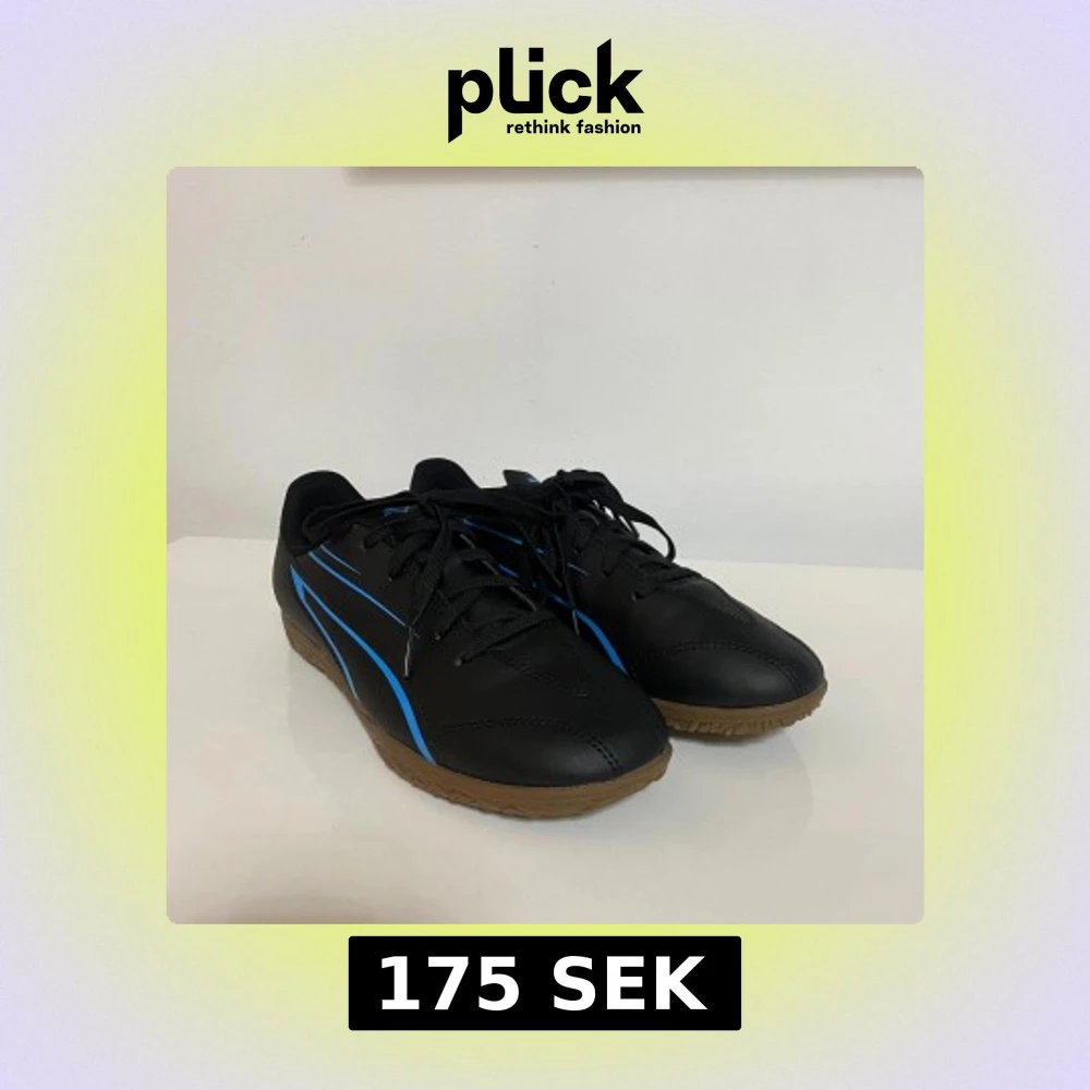 Säljer ett par svarta fotbollsskor från Puma med blå detaljer och bruna gummisulor. Skorna har snörning och är tillverkade i syntetmaterial. Perfekta för dig som vill ha stilrena och sportiga skor till planen.