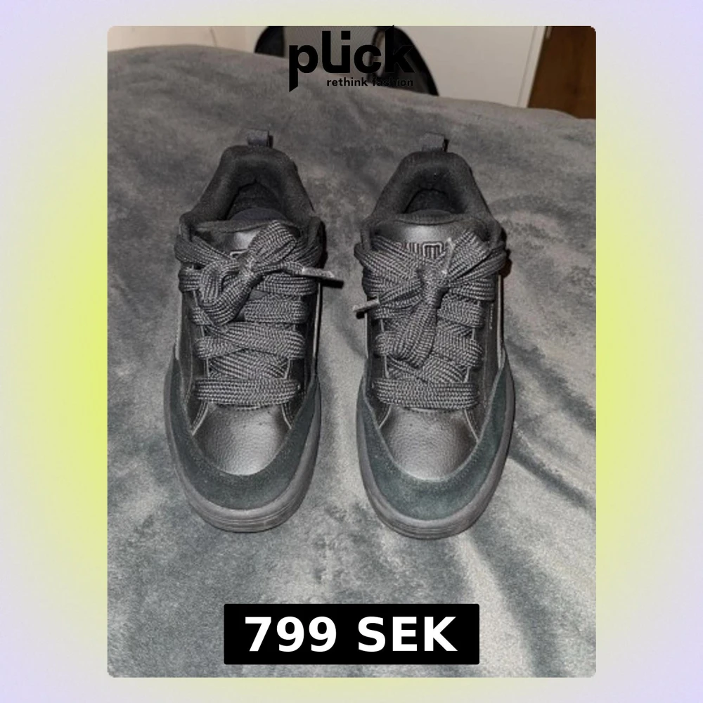 Säljer ett par svarta Puma sneakers med chunky sula och breda snören. Skorna är gjorda i en mix av skinn och mocka, med klassisk Puma-logga på sidan. Låg modell med rund tå och platt sula, perfekta till streetwear eller casual outfits.