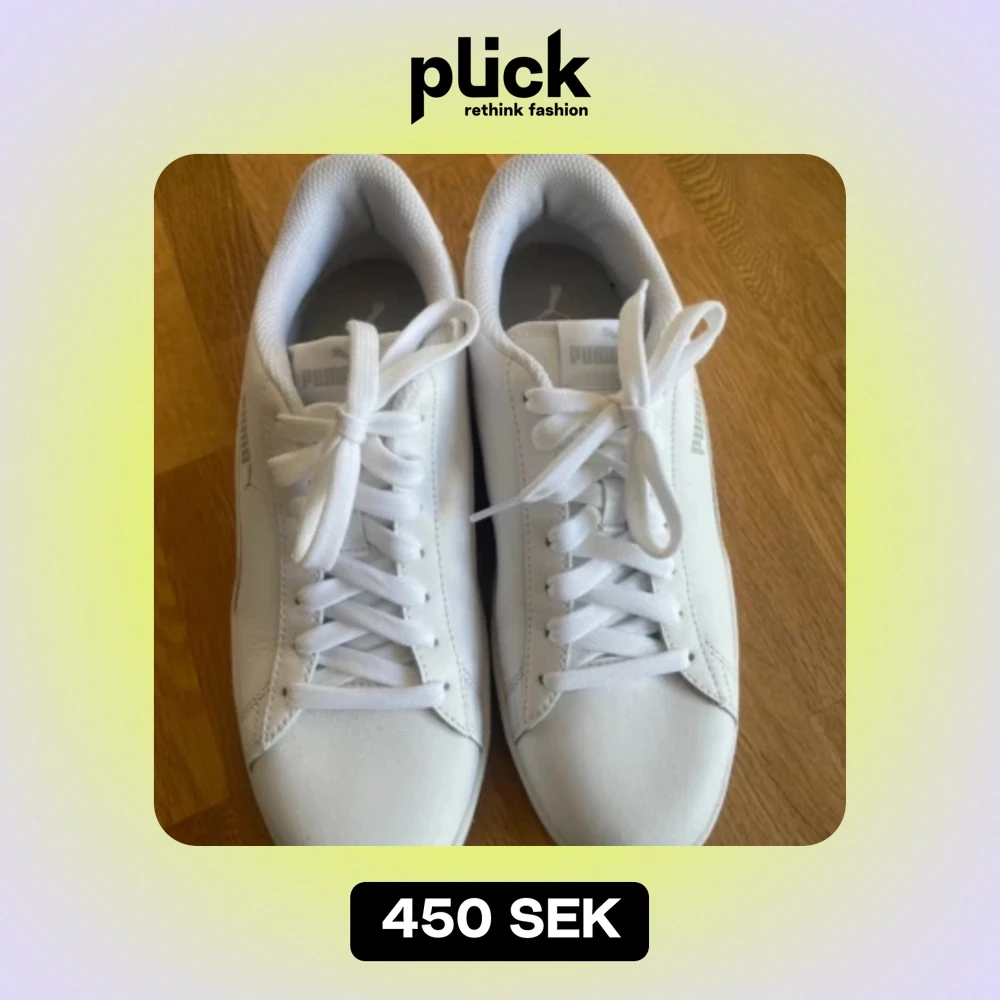 Säljer ett par vita sneakers från Puma i nyskick. Skorna är tillverkade i syntetmaterial och har en klassisk design med snörning framtill. Perfekta för vardagsbruk och passar till nästan alla outfits. Storlek är inte specificerad, men de ser ut att vara i normal passform.