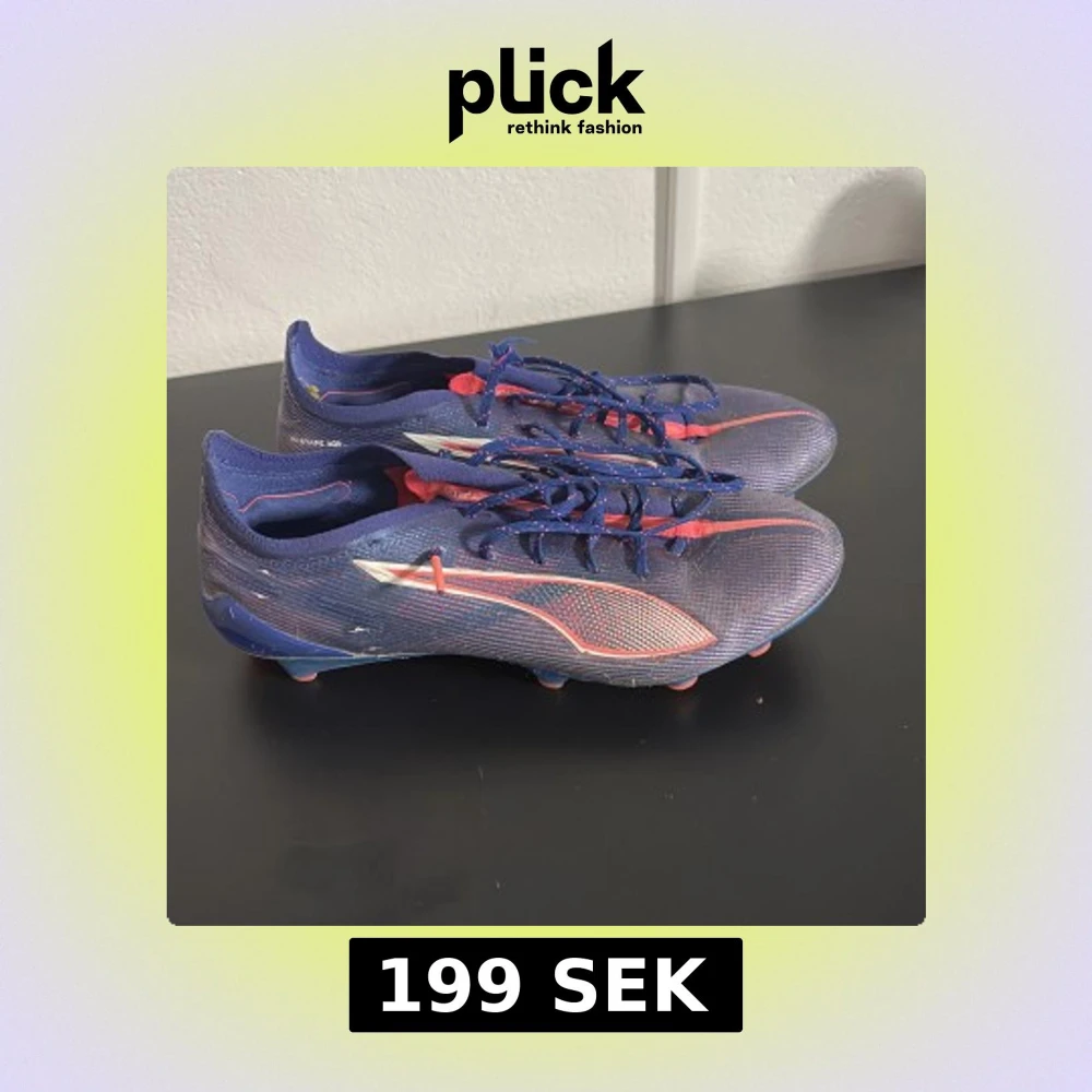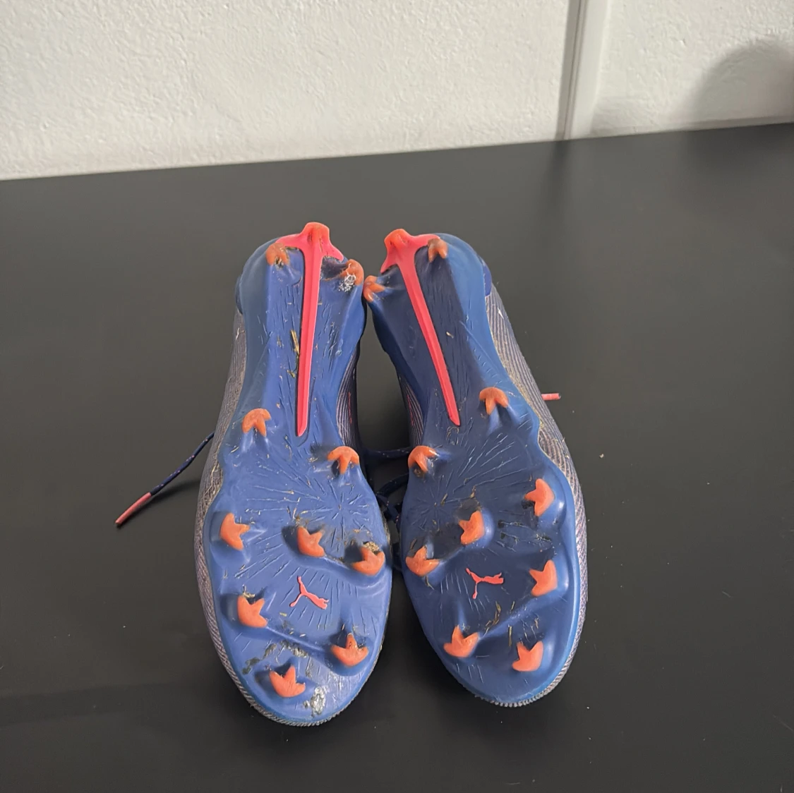 Säljer ett par snygga blåa Puma fotbollsskor med orange och röda detaljer. Skorna har snörning och en lätt, syntetisk ovandel samt dobbar på sulan för bra grepp på planen. Perfekta för dig som vill sticka ut på fotbollsplanen!