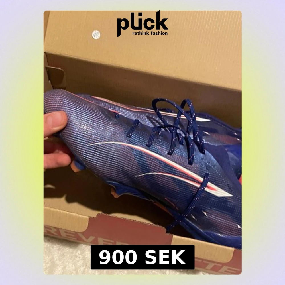 Säljer ett par Puma Ultra fotbollsskor i mörkblå med röda och vita detaljer. Skorna har snörning och en smal, aerodynamisk form med platt sula och dobbar för gräsplan. Ovandelen är tillverkad i syntetmaterial med en glansig finish och mönstrad struktur.