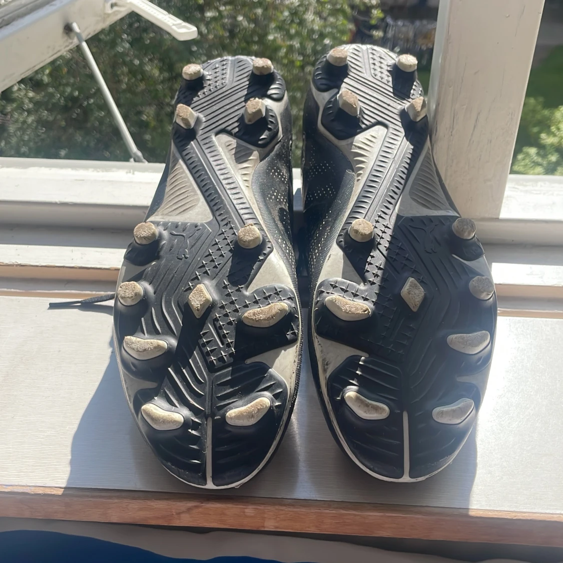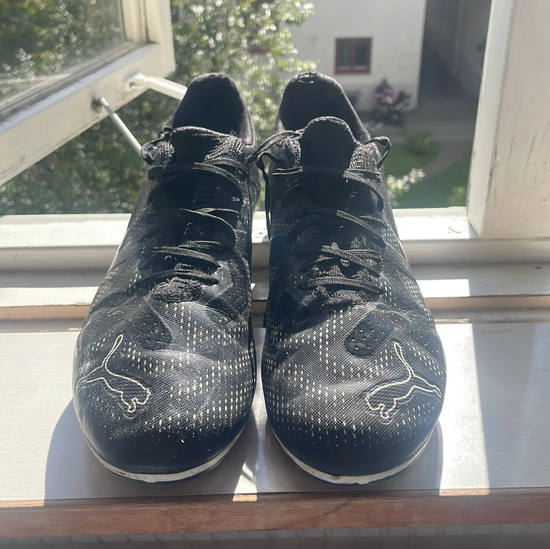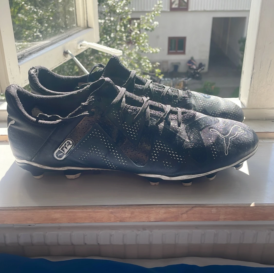 Svarta fotbollsskor från Puma med vita detaljer och logga på tån. Skorna har snörning och mönstrad ovandel i syntetmaterial. Sulan har fasta dobbar för bra grepp på planen. Perfekta för dig som vill ha stilrena och sportiga skor till matchen.
