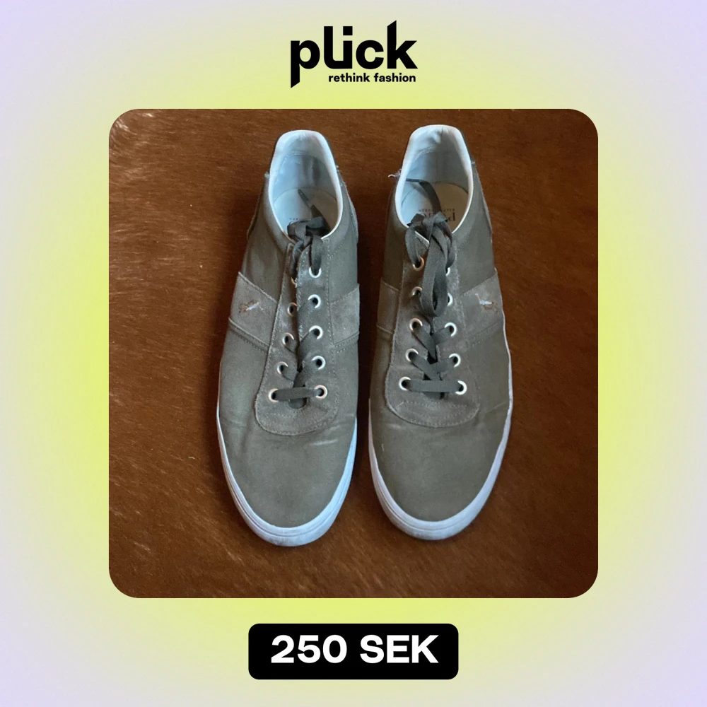 Säljer ett par gröna sneakers från Polo Ralph Lauren i bra skick. Skorna har en klassisk design med snörning och broderad logga på sidan. De är tillverkade i mocka och syntetmaterial med en bekväm sula. Perfekta för vardagsbruk och ger en stilren look.