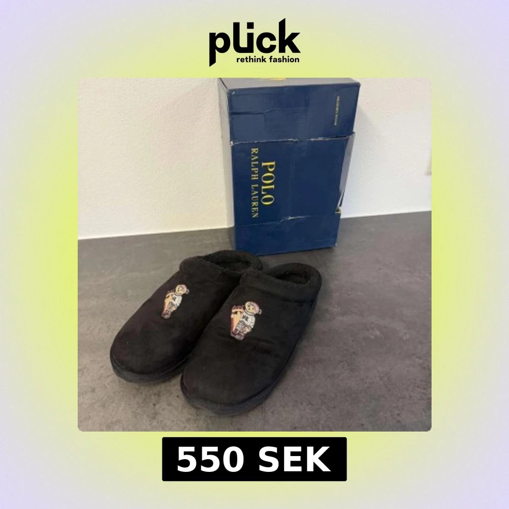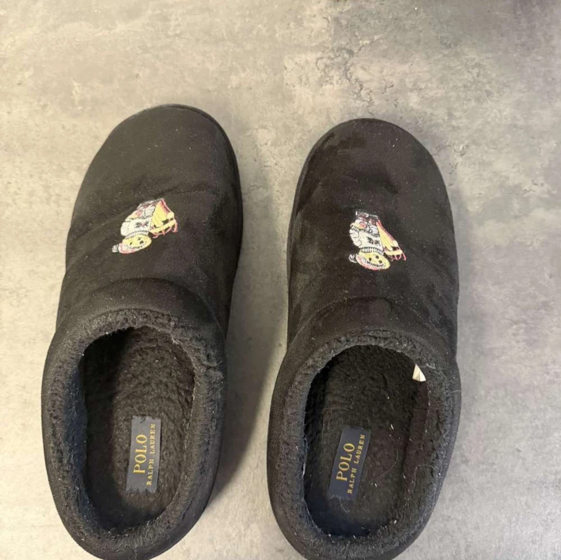 | Mysiga svarta tofflor från Polo Ralph Lauren med broderad björn i vinteroutfit på ovansidan | | Utsidan är i mjuk mocka och insidan är fodrad för extra komfort. | Perfekta att glida runt i hemma under kalla dagar. | Storlek 43 | Skriv vid frågor |