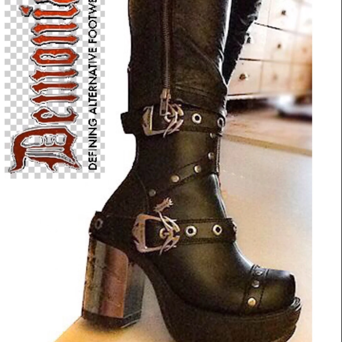 DEMONIA Sinister-201. Nitar, justerbara remmar, metallpännen, kromad klack. Extra dragkedja för justering av vidd. SVART veganläder Klack 8,9 cm Platå 3,8 cm Största omkrets på vaden: 29.50 cm Höjd utan klack: 19.90 cm HELT NYA, ENDAST PROVADE. +Frakt