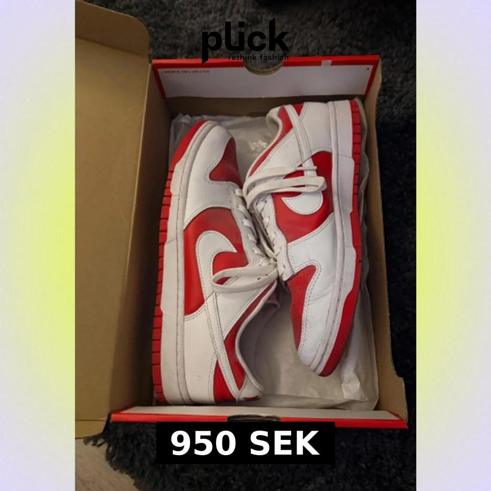 Nike Dunk Low Retro i färgen University Red/White. Klassiska sneakers med vit och röd ovandel i skinn, vit sula och röda detaljer. Lågt skaft och snörning framtill. Perfekta för dig som gillar streetwear och vill sticka ut med en ikonisk modell. Nypris: 2200, använt fåtsl gånger