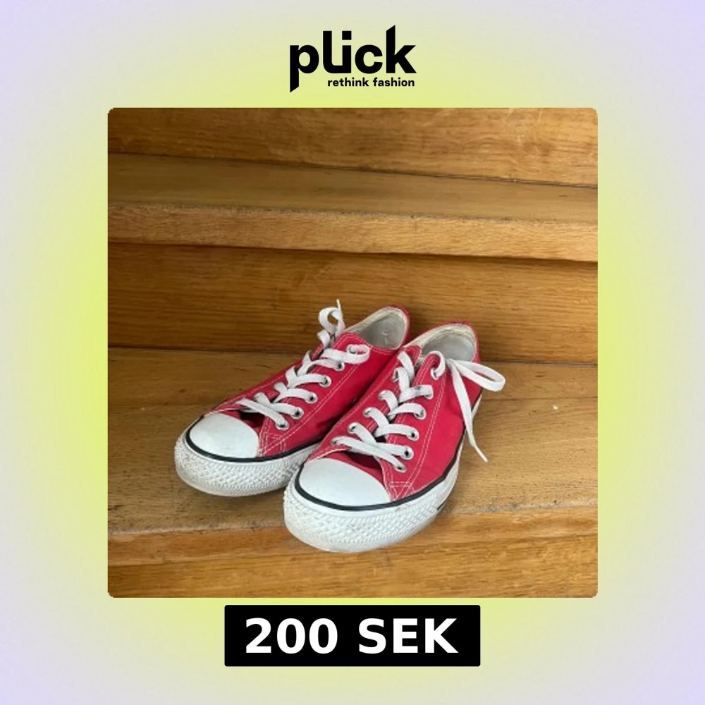 Klassiska röda Converse All Star sneakers med vit sula och vita snören. Låg modell med rund tå och platt sula. Pris kan diskuteras