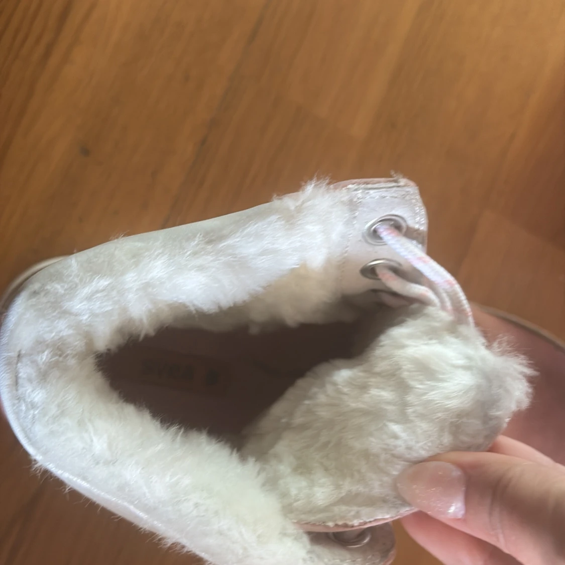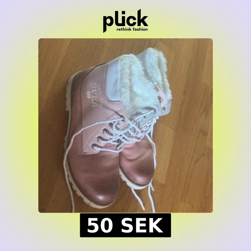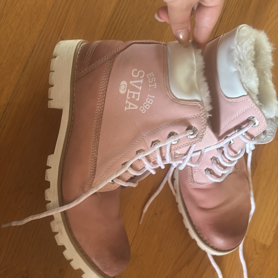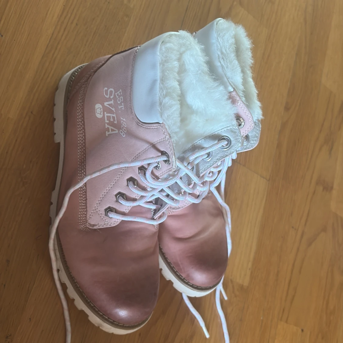 Snygga rosa kängor från SVEA med vit pälsfoder och vita snören. Grov sula för bra grepp och logga på sidan. Perfekta för kalla dagar med sin fluffiga insida och coola look. Kombinerar stil och funktion för vintern.