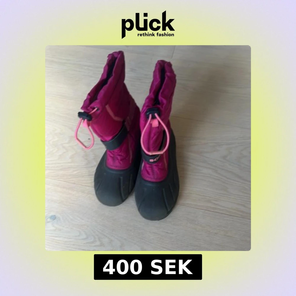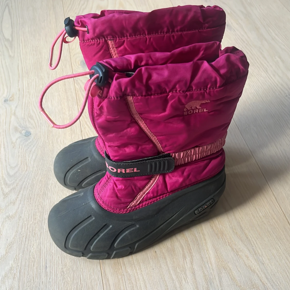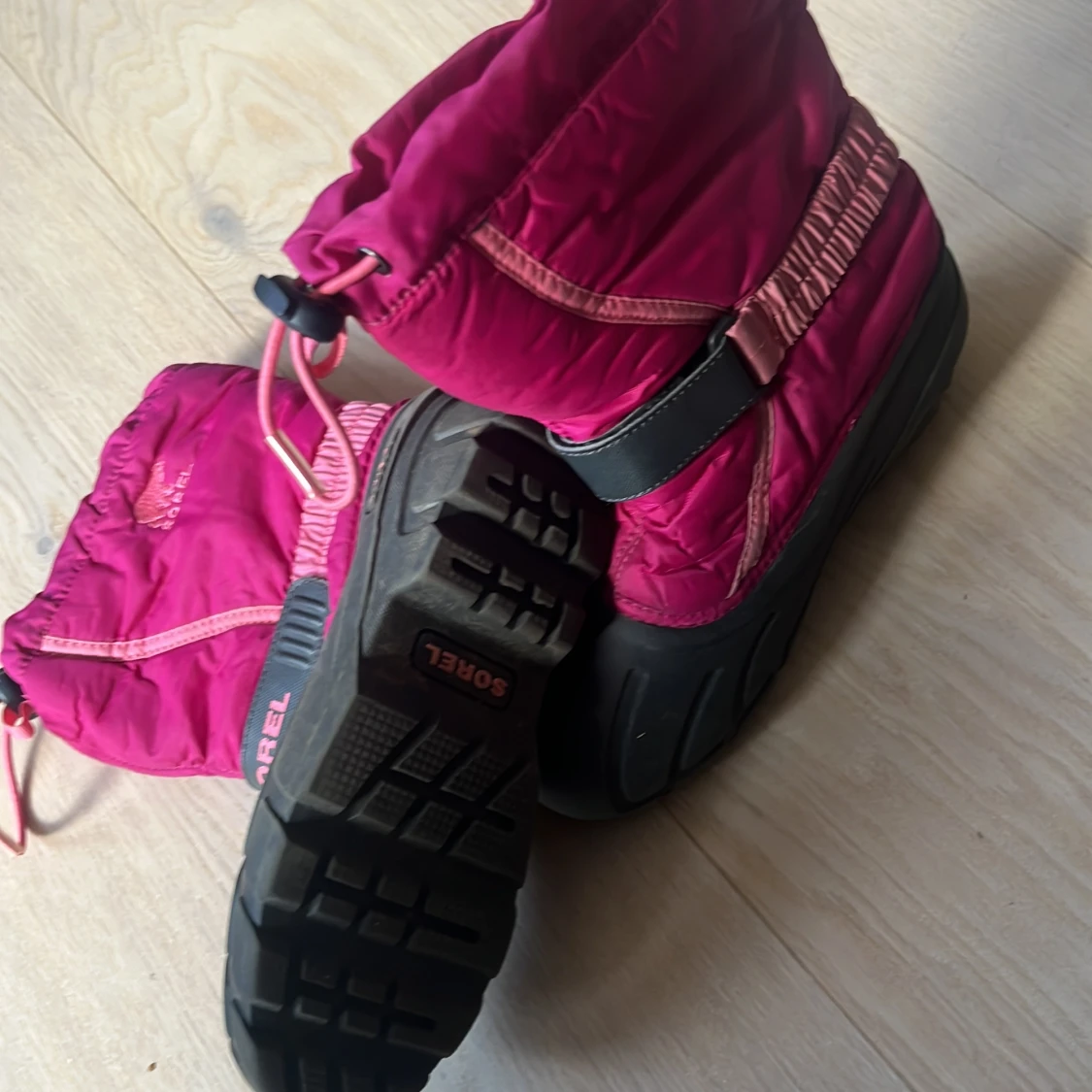 Snygga rosa vinterstövlar från Sorel med svart gummisula och grovt mönstrad yttersula. Stövlarna har dragsko upptill och kardborreband över vristen för extra bra passform. Perfekta för kalla dagar och snöiga äventyr. Aldrig använda.