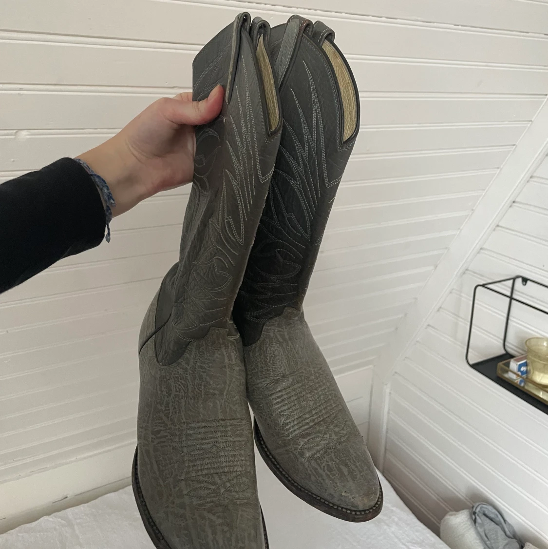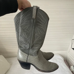 Så snygga cowboyboots köpta på en secondhandbutik i Paris!!🤠🤠Färgen är jättefin, lite grå/grön/silvrig ish och de har blåa sömmar 🧵. Jag har strl 39-40 och de är tyvärr för små för mig.😩Skulle passa 37/38!!🌟🌟