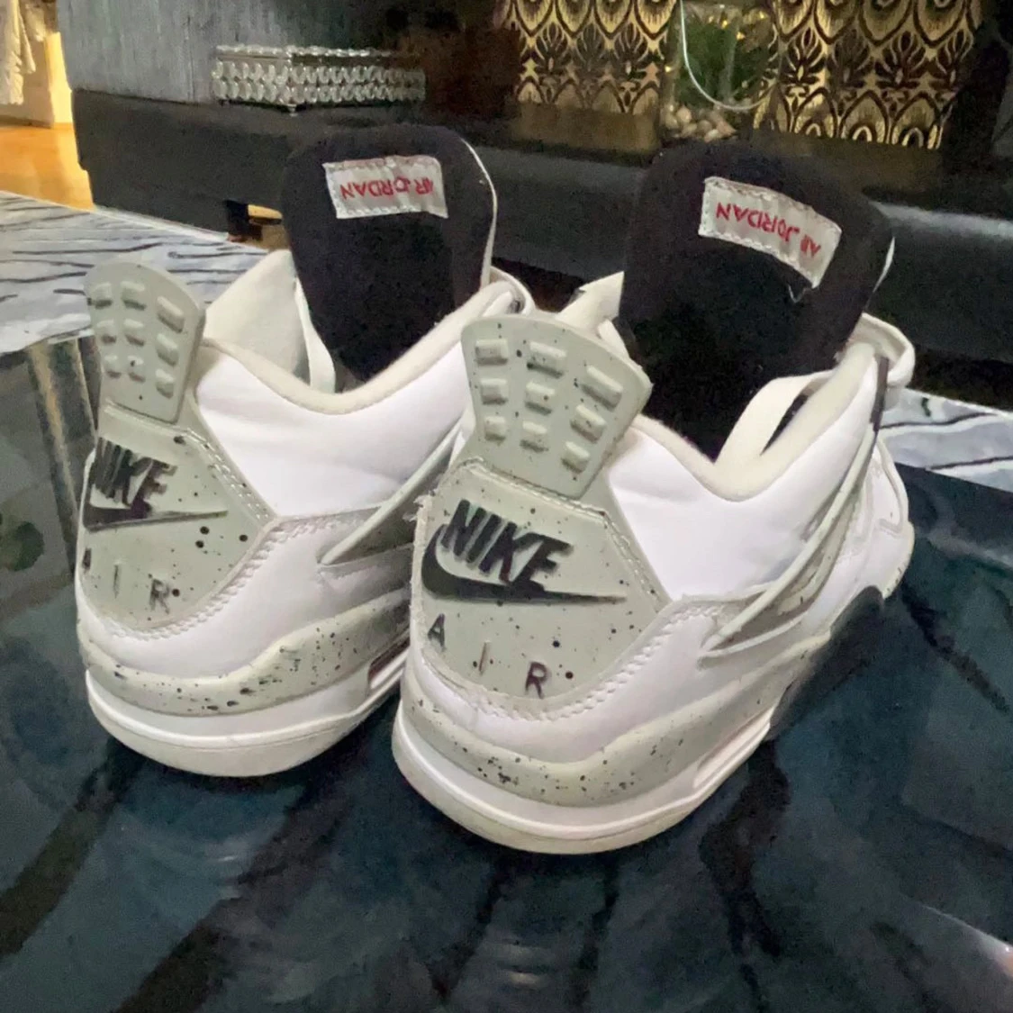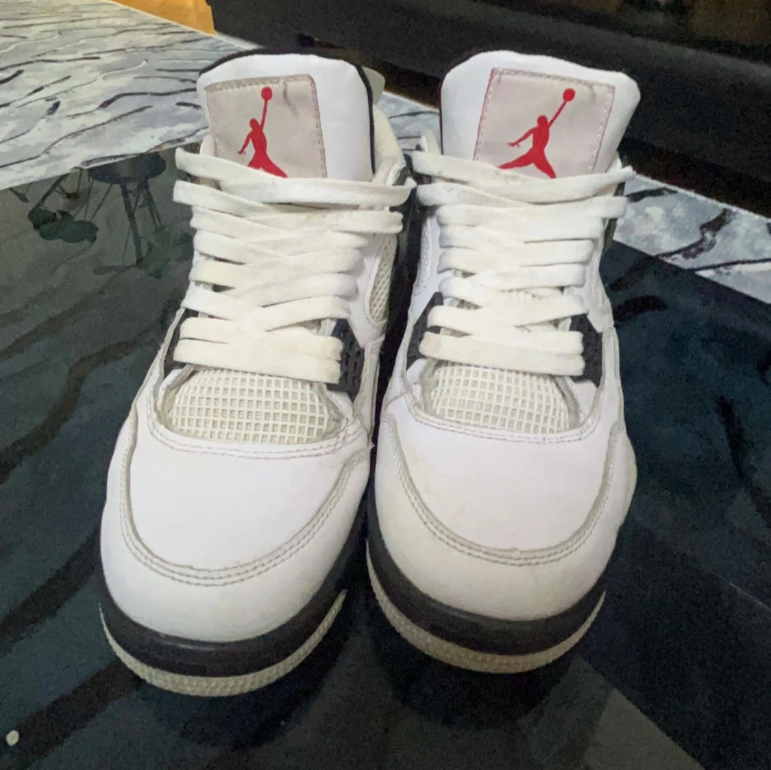Säljer ett par snygga Nike Air Jordans i vitt med grå och svarta detaljer. Skorna har den klassiska Jumpman-loggan i rött på plösen och Nike Air-loggan på hälen. Perfekta för både vardag och fest! De är i mycket bra skick och redo för nya äventyr. Dom e lite smutsiga kan tvätta dom, Priset kan diskuteras