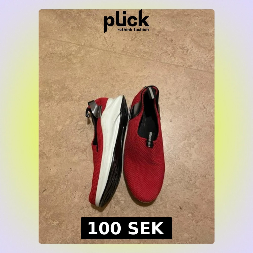 Snygga röda slip-on sneakers med svart och vit tjock sula. Ovandelen är i mesh-liknande syntetmaterial och har en svart detalj med reflex vid hälen. Skorna har rund tå och är perfekta för dig som gillar sportig stil.