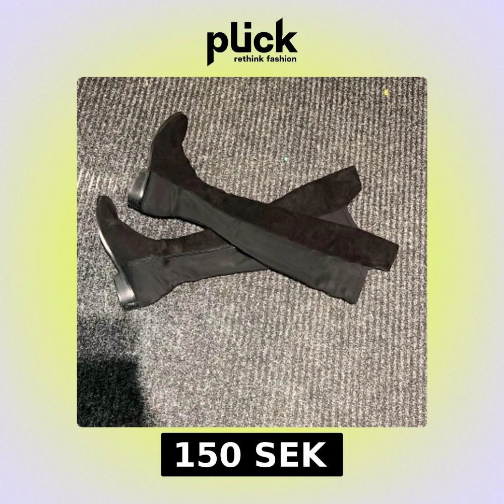 Snygga svarta overknee stövlar i mocka med dragkedja på sidan. Perfekta för en stilren look och passar bra till både kjol och jeans. De har en låg klack och en spetsig tå som ger en elegant touch.