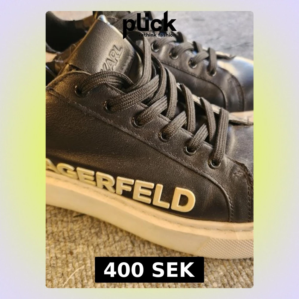 Svarta sneakers från Karl Lagerfeld med vit, grov sula och tydlig logga på sidan. Skorna har svart snörning och häl med präglad logga. Snygga och perfekta för dig som gillar streetstyle. Stl 37 men passar även en mindre 38.