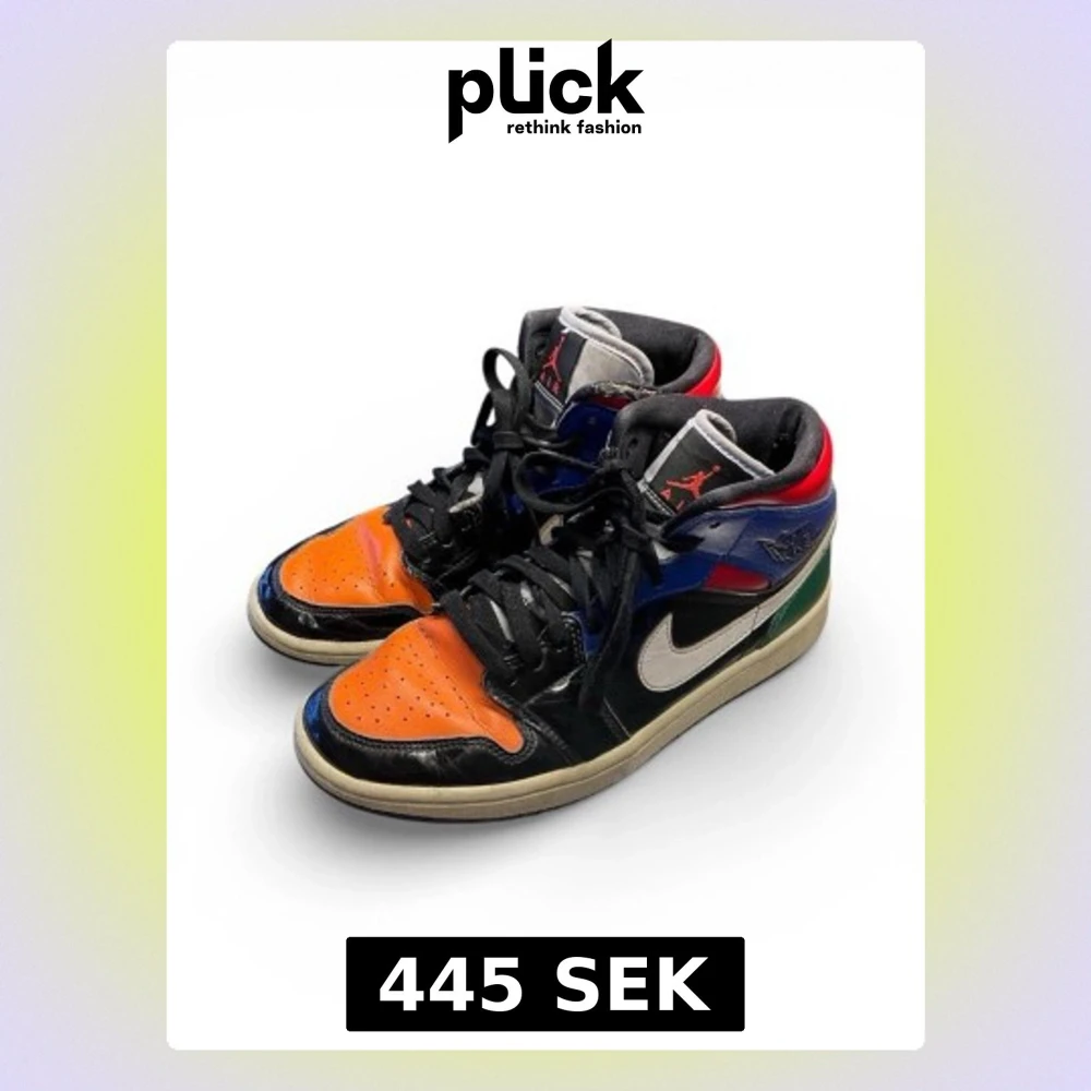 Unika Nike Air Jordan 1 Highs med färgstark design i orange, svart, blått, rött, grönt och vitt. Skorna har klassisk snörning, rund tå och vit sula. Tillverkade i skinn med glansig finish och ikonisk Swoosh på sidan. Perfekta för dig som vill sticka ut.