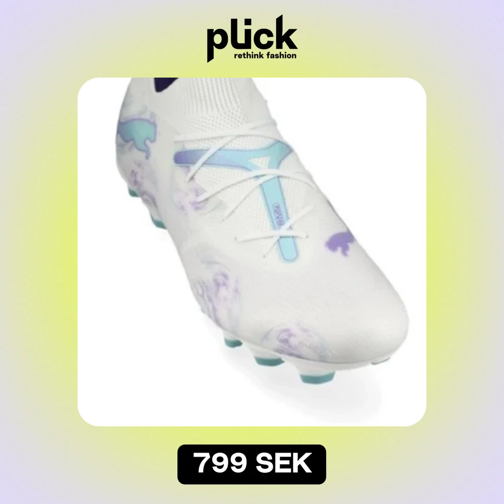 Säljer ett par snygga vita fotbollsskor från Puma med coola lila och blå detaljer. Skorna har en modern design med snörning och är perfekta för fotbollsträning eller match. De har en lätt och bekväm passform som ger bra grepp på planen.