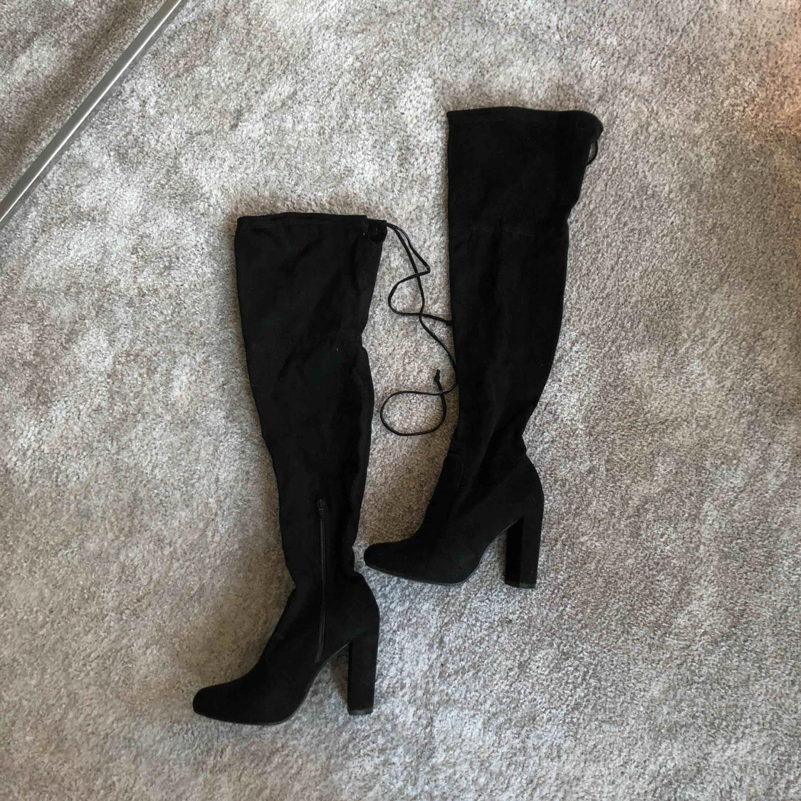 Lårhöga stövlar i mockaimitation. Använda en gång, som nya. Köparen står för frakt