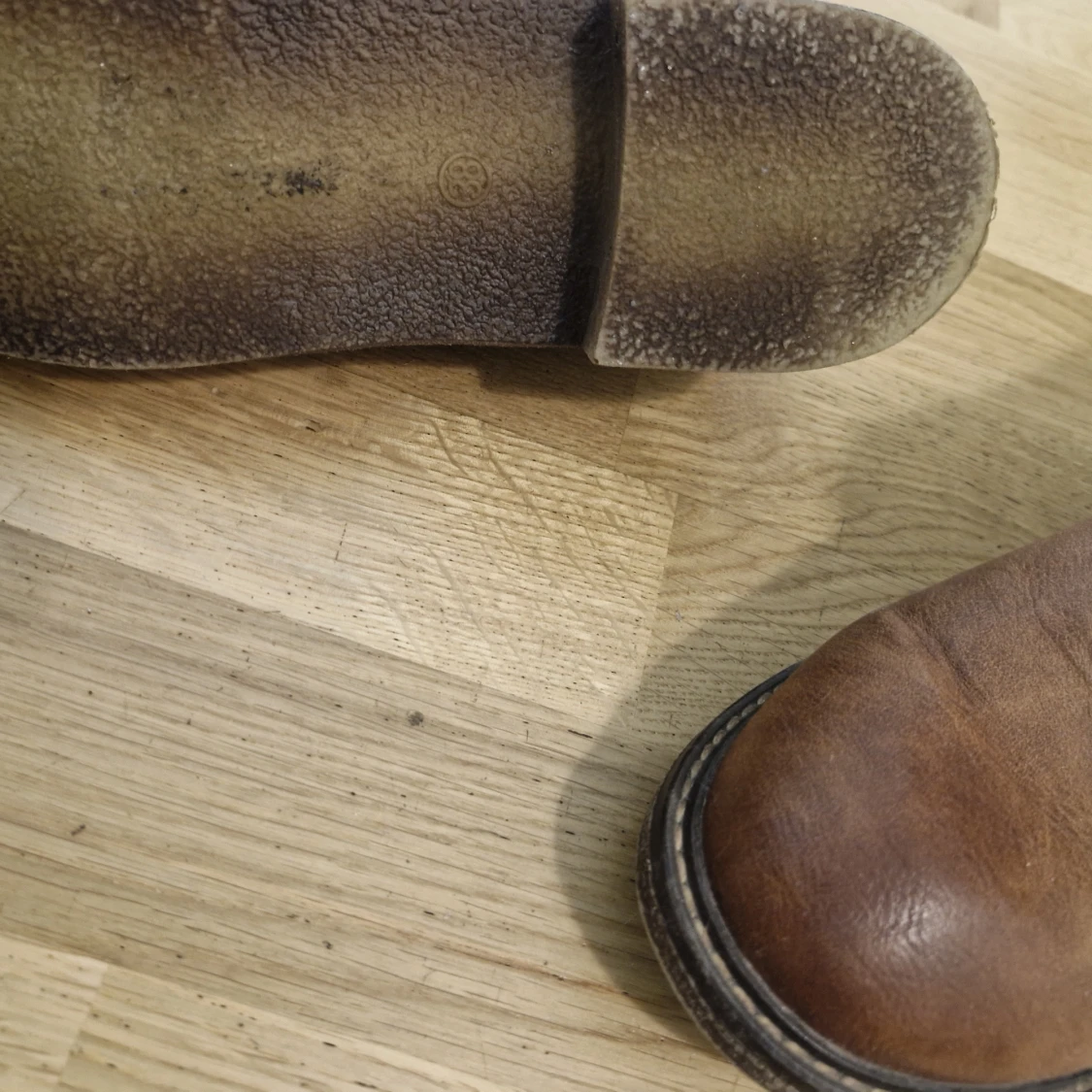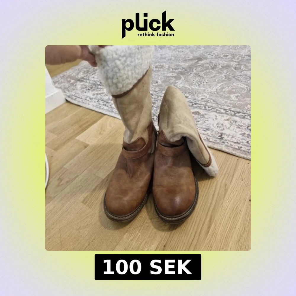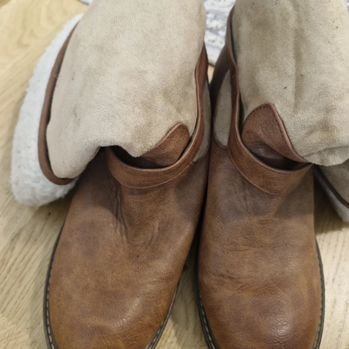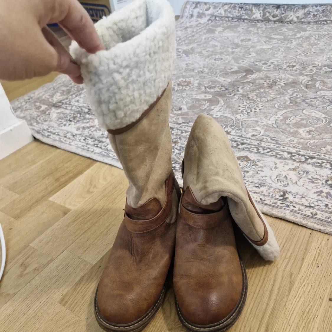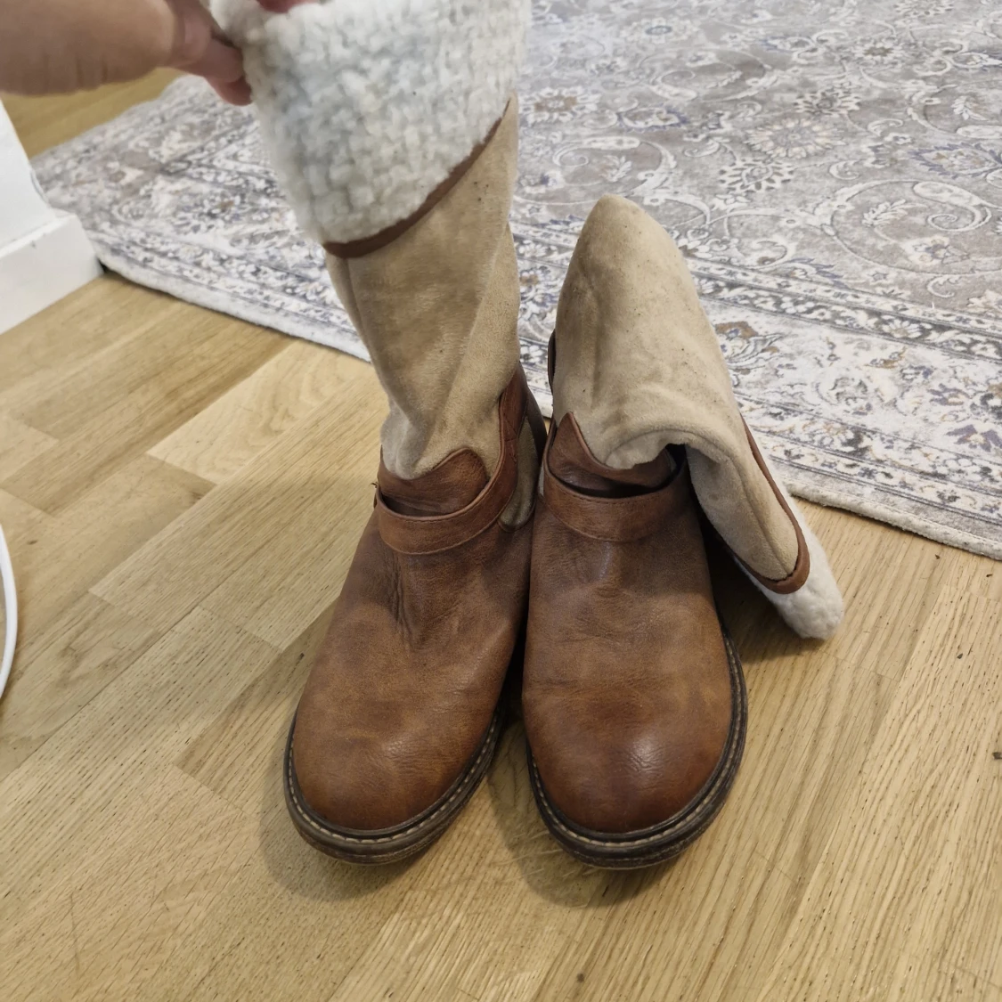 Snygga höga boots i brunt skinn med beige mockaskaft och spänndetalj vid sidan. Insidan är fodrad med mjukt vitt foder för extra värme. Rund tå och robust sula gör dem perfekta för kyligare dagar. Perfekt till jeans eller kjol för en cool look.