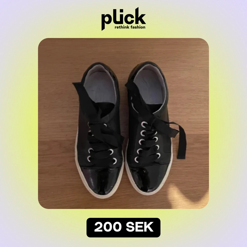 Svarta sneakers med mocka och lackdetalj - Säljer ett par svarta sneakers med ovandel i mocka och snygg lackad tå. Skorna har vita sulor, snörning och metallöljetter på sidan för extra ventilation. Perfekta för dig som gillar en stilren men ändå unik look.