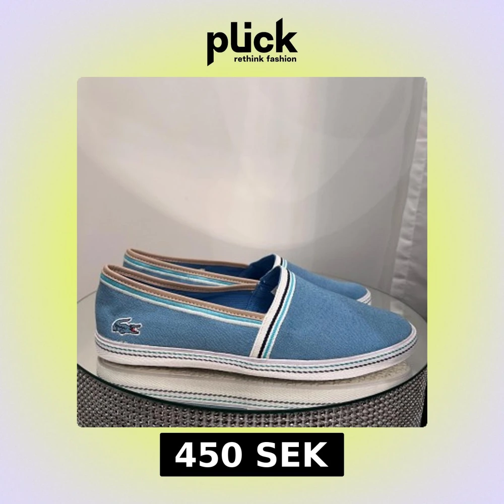 Snygga ljusblå slip-on sneakers från Lacoste med vit sula och diskreta ränder längs kanten. Skorna har det klassiska Lacoste-krokodilen broderad på sidan och insida med randigt tyg. Perfekta för en avslappnad stil.