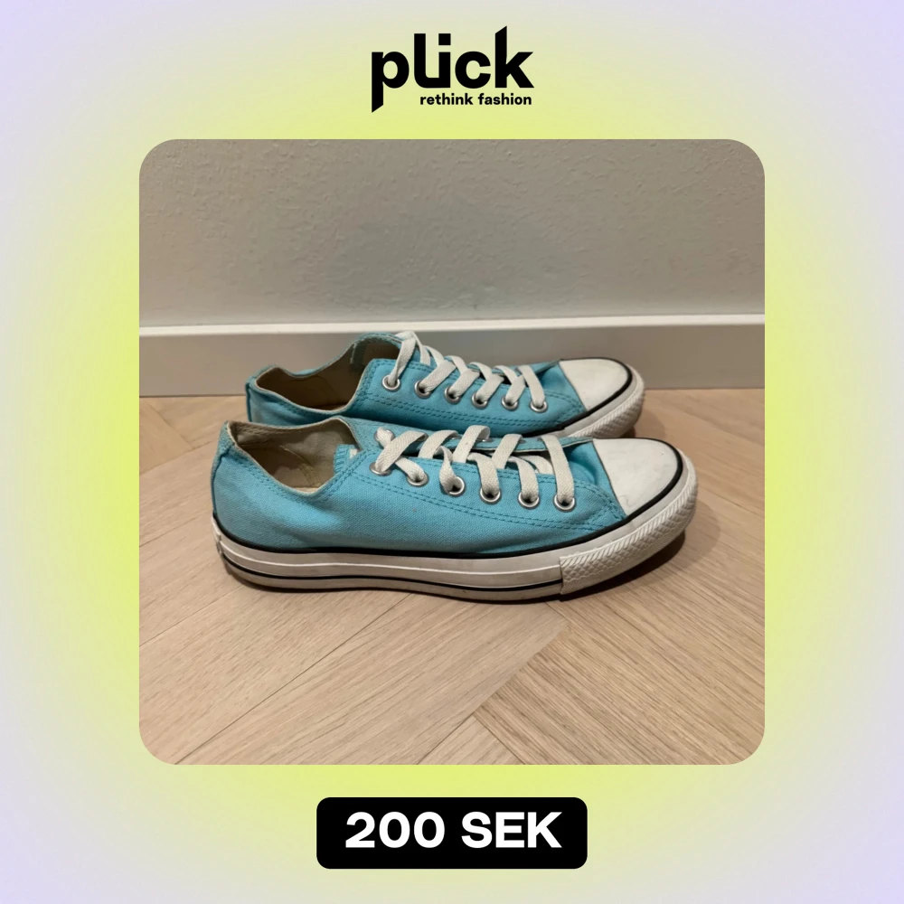 Säljer ett par turkosa Converse All Star sneakers med vita snören och tåhätta. Klassisk design med textilmaterial och gummisula. Perfekta för en avslappnad stil.