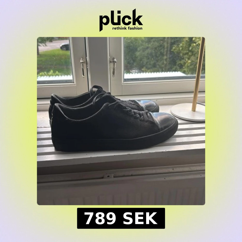 Säljer ett par svarta sneakers från Sneaky Steve med ovandel i mocka och tåparti i blankt material. Skorna har snörning och en platt sula, perfekt för en clean och stilren look. Klassisk rund tå och helsvart design som funkar till det mesta.