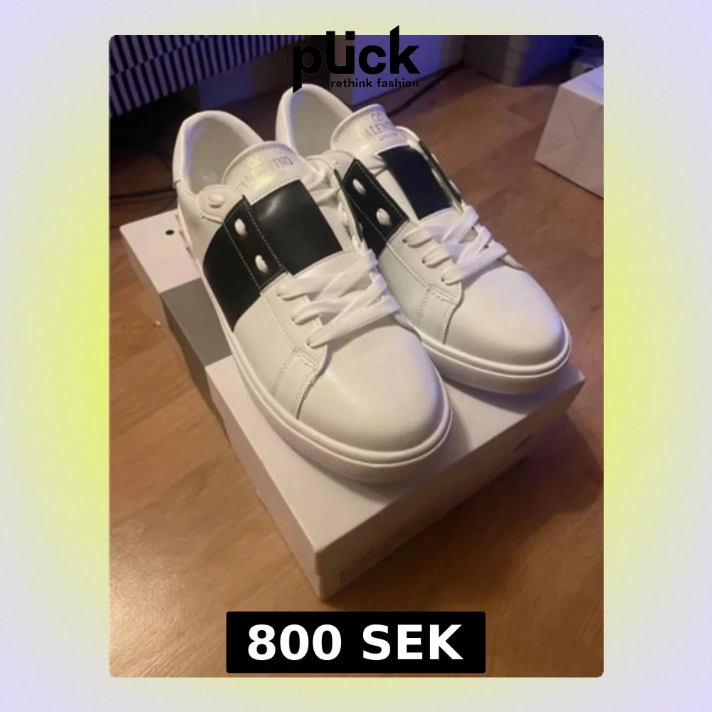 Snygga vita sneakers från Valentino Garavani med bred svart rem och silvriga nitar på sidan. Skorna har rund tå, platt sula och klassisk snörning. Tillverkade i skinn för en lyxig känsla och stilren look. Perfekta för dig som gillar exklusiva märken.