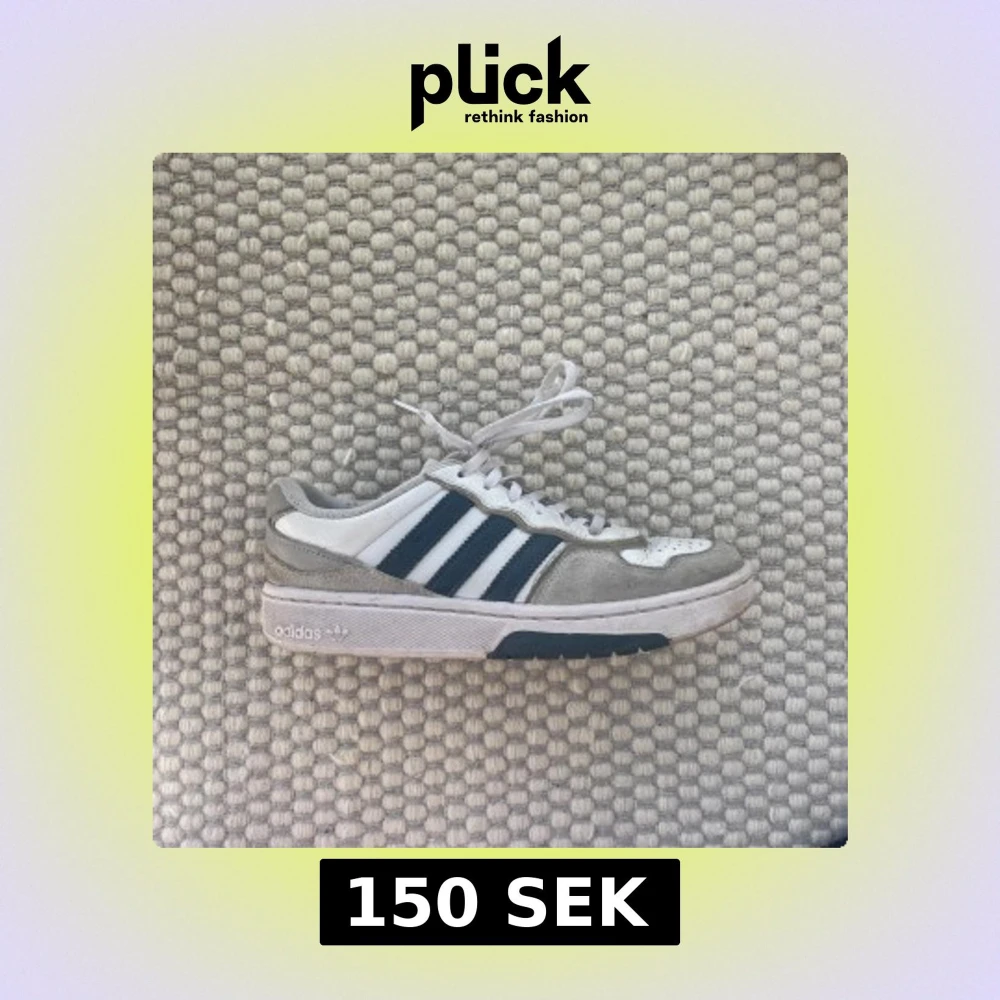 Säljer ett par klassiska Adidas sneakers i vitt med blå ränder och grå detaljer. Går att byta skosnören samt tvätta skorna för en nyare look.
