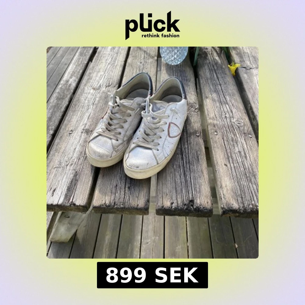 Säljer ett par vita sneakers från Philippe Model. Skorna har en rund tå och snörning framtill. De är tillverkade i skinn med detaljer i rött och blått på hälen. Perfekta för en avslappnad stil. Skorna är mycket slitna och är kraftigt mörka på ena sidan av en sko, sulan är sprucken vilket bilden visar men det märks ofta inte av. Innersulan är sliten så rekommenderar att köpa nya sulor vid användning av skorna.😇🤗