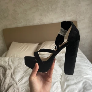 Jätte snygga högklackade skor, svart sammet storlek 37 (5). Snören man knyter runt benen som fin detalj!