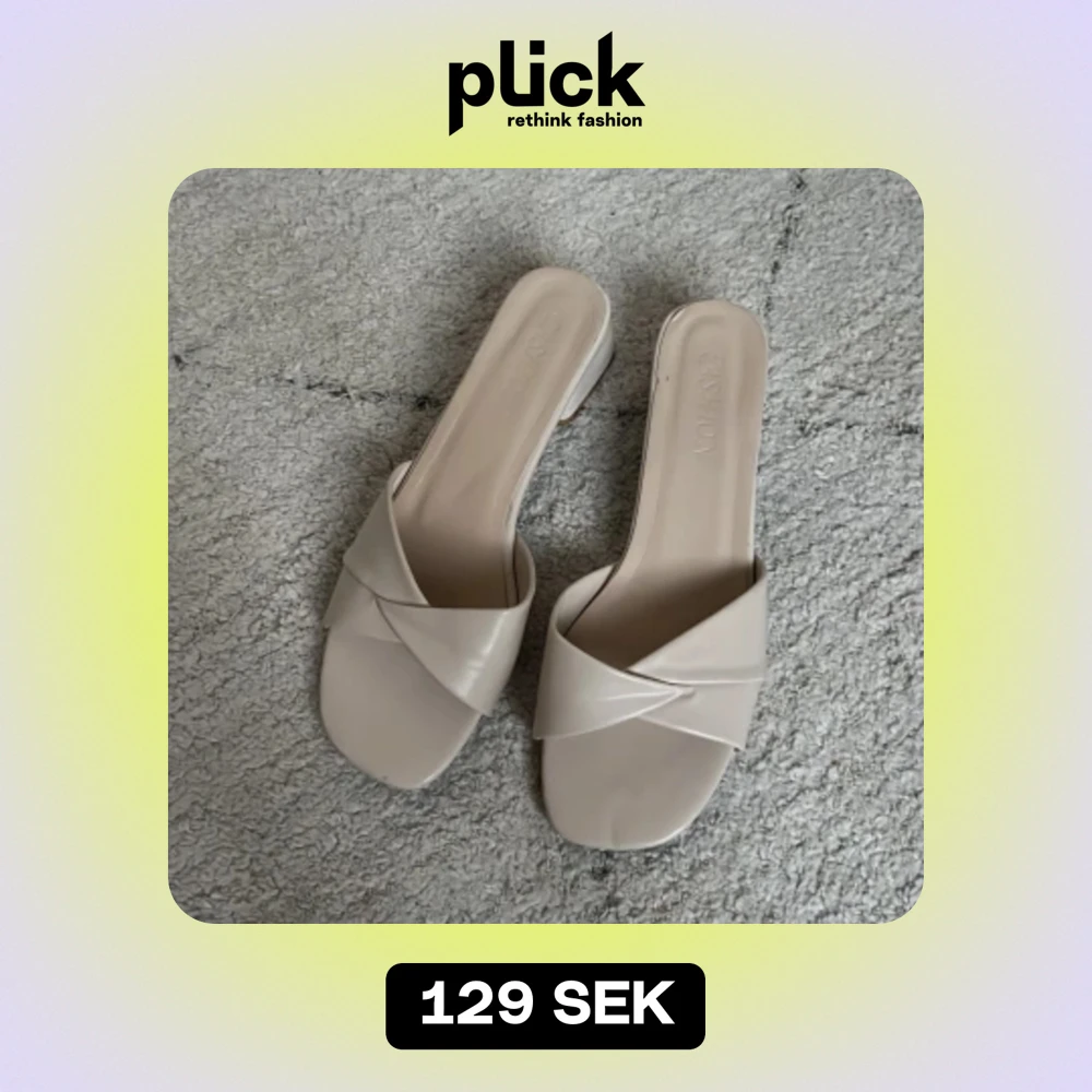 Ett par eleganta beige sandaler med en liten klack. Sandalerna har en korsad remdesign över foten och en öppen tå. De är tillverkade i syntetmaterial och har en bekväm passform. Använd två kvällar!☺️🌟💛