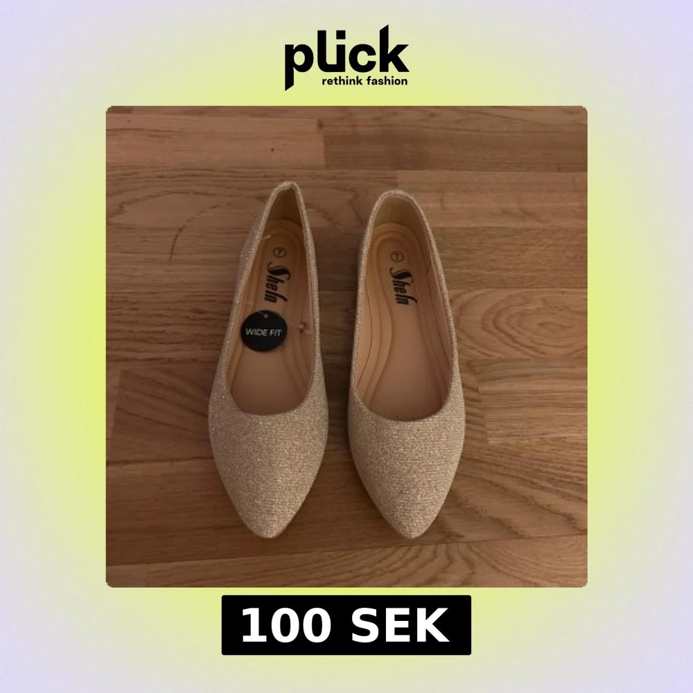 Snygga glittriga ballerinaskor i guld med spetsig tå och bred passform. Perfekta för att lägga till lite glamour till din outfit. Skorna har en låg klack och är bekväma att bära hela dagen. osäker på storleken i eu storlekar.