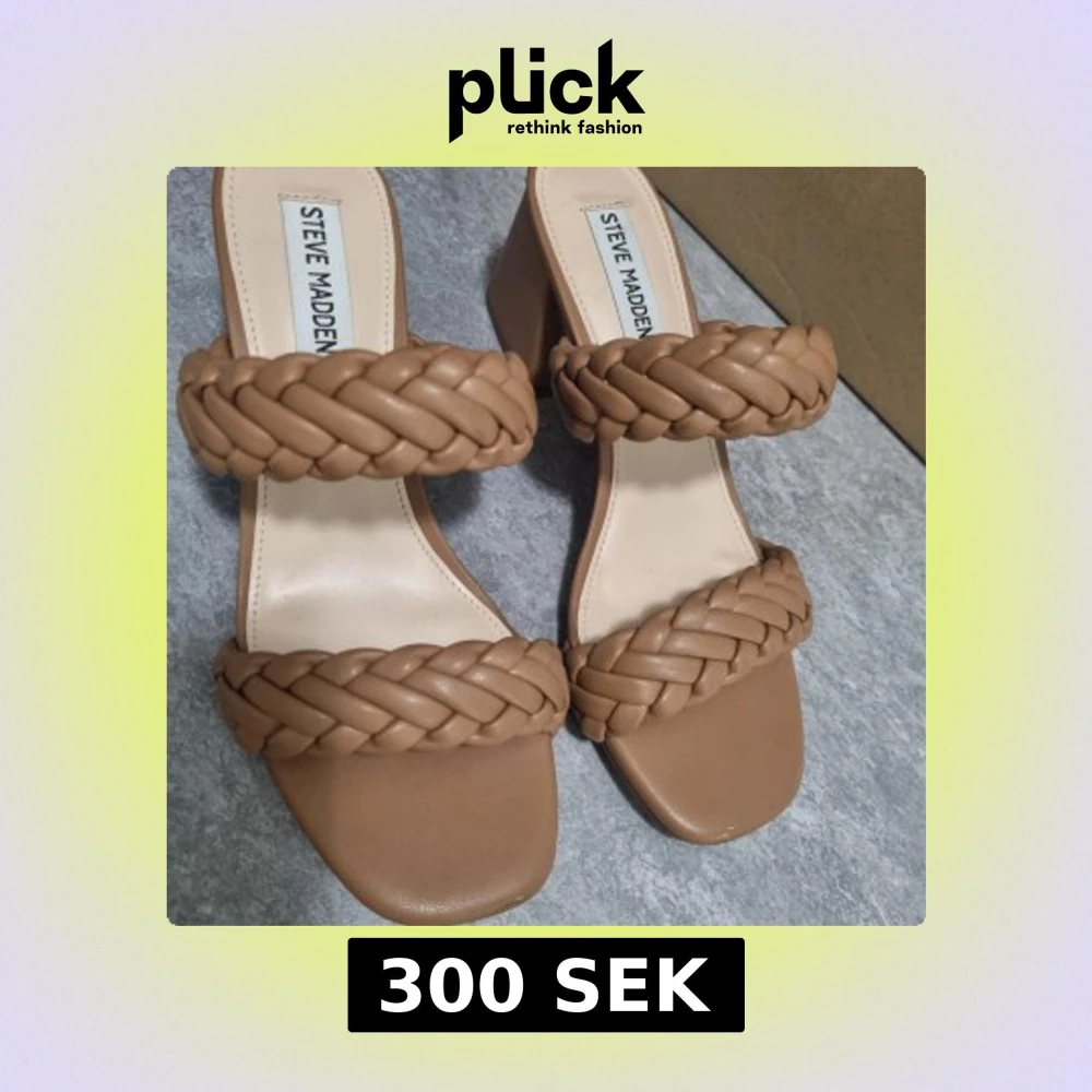 Snygga bruna sandaler från Steve Madden med två breda flätade remmar och fyrkantig tå. Skorna har en klack och öppen design, perfekta för varmare dagar. Stilrena och trendiga att matcha till många outfits. Dessa har används en gång därför är de smutsiga undersidan, annars är de som nya. Skolådan finns kvar.