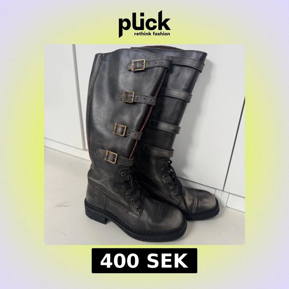 Snygga svarta höga boots i skinn med flera dekorativa spännen och snörning framtill. Perfekta för en edgy look och passar bra till både jeans och kjol.