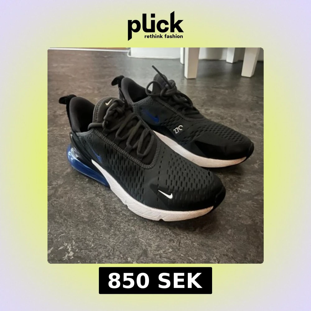 Nike Air Max 270 sneakers i svart och mörkgrå mesh med blå detaljer och stor synlig Air Max-enhet i hälen. Skorna har snörning, rund tå och vit sula. Perfekta för dig som gillar sportig och modern stil.