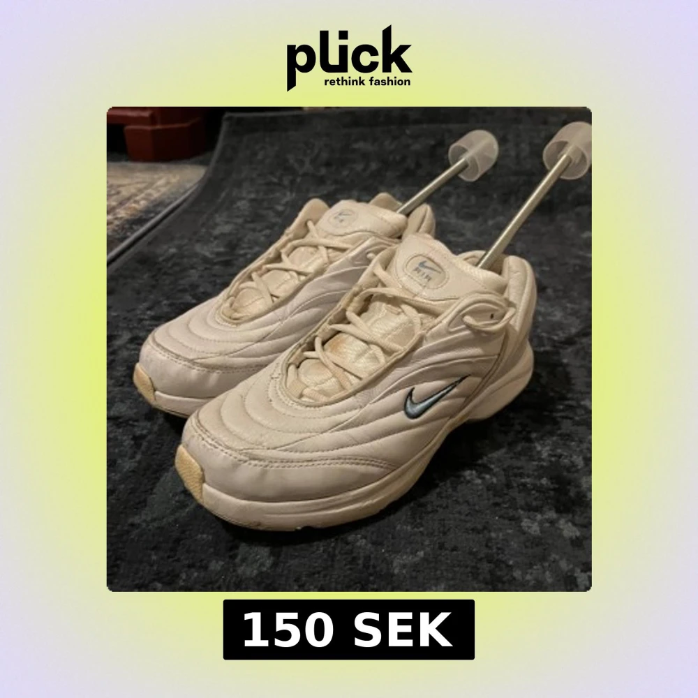 Nike Air sneakers i retrostil med vit ovandel i skinn och syntet. Snygga vågformade sömmar, klassisk Nike Swoosh i silver på sidan och robust sula med mönstrad undersida. Skorna har snörning och en chunky siluett som sticker ut.